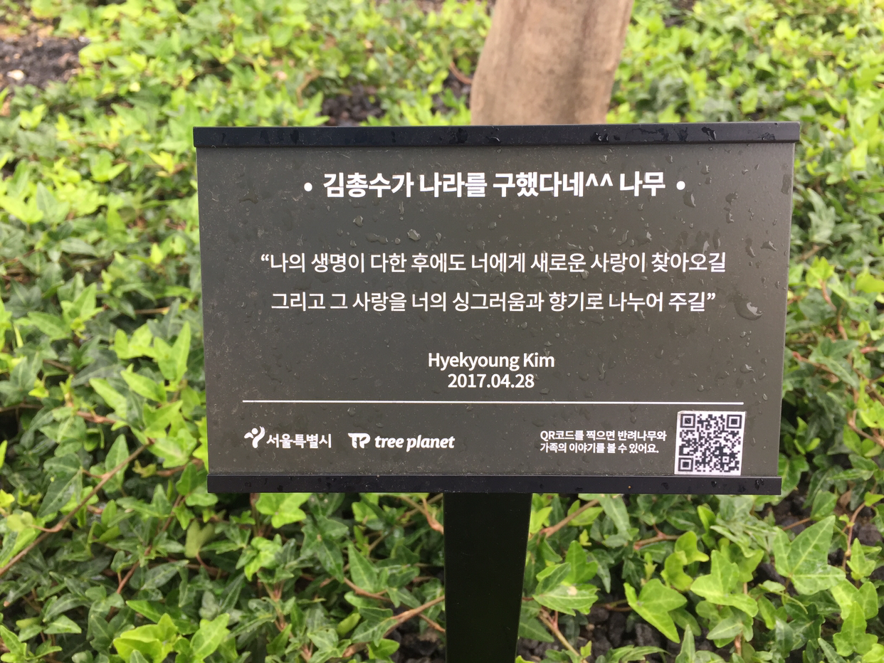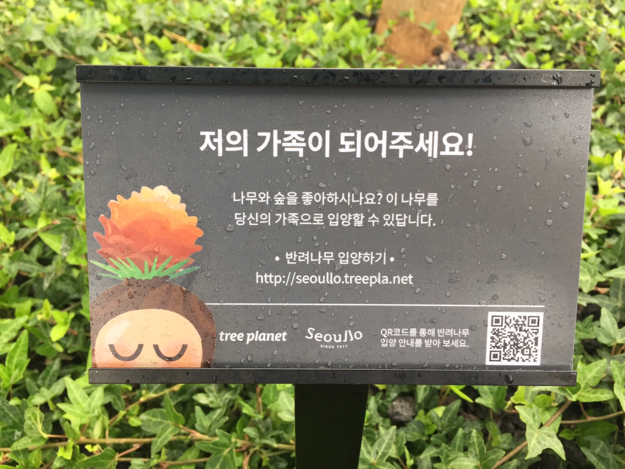 재밌는 푯말이 눈에 띈다. '김총수가 나라를 구했다네 나무'라니. 트리플래닛이라는 사회적 기업과 함께 서울시가 반려나무 심기 캠페인을 하는 모양이다. 호기심에 QR코드를 찍어봤지만 아직 김총수 씨의 이야기가 실려 있진 않았다. 아쉬운 대목.