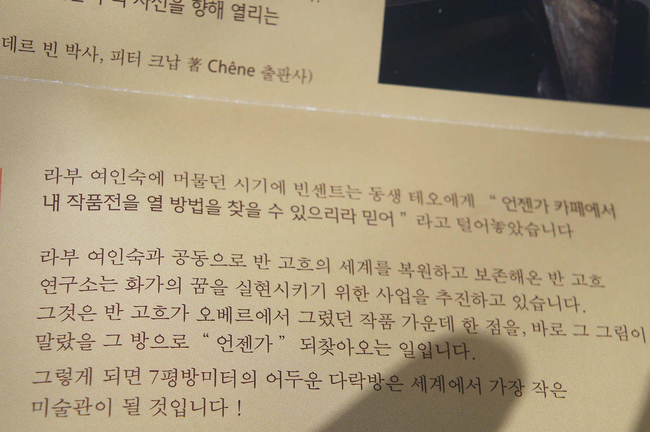 한국인 여행객들이 많이 찾는지 한국어로 된 안내문도 있었다. 그가 테오에게 했던 말에 오래 시선이 머물렀다. "언젠가 카페에서 내 작품전을 열 방법을 찾을 수 있으리라 믿어."