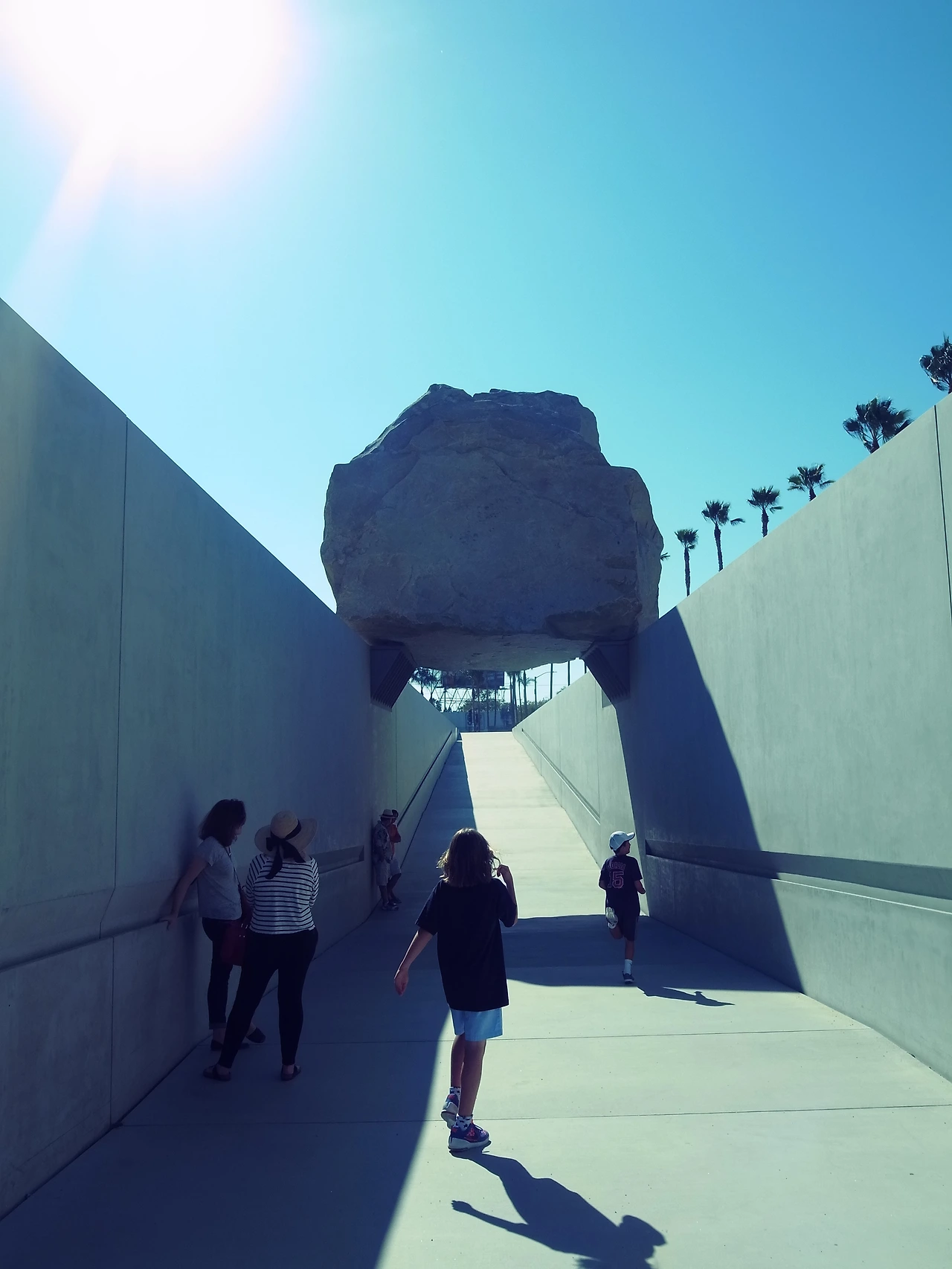 <공중에 떠 있는 돌>이란 이름이 붙은 이 바윗덩어리는 그 예술적 함의보다 수송 비용에 더 귀가 쫑긋했던 작품이다. 수송 과정이 미국 전역에 생중계될 정도로 화제를 모았던 이 돌은 무려 340톤, 수송 비용은 천만불이 들었다고 한다. (오 마이 갓) 이 작품을 기획한 마이클 하이저의 이야기가 사뭇 흥미롭다. 24살의 마이클 하이저는 아주 오래 전, 매우 거대한 돌로 자신들의 예술을 했던 선사시대를 기리고 싶다는 생각을 한다. 크레인이 부서지고, 알맞는 돌을 찾지 못하며 보낸 40년의 세월이 지나 그는 드디어 이 돌을 발견한다. 그리고 2012년 LACMA에 기어이 이 작품을 걸었다. 그 이야기를 알고 거대한 돌덩이를 올려다보니 캘리포니아의 쨍한 태양에 눈을 제대로 뜰 수 없다. 하늘과 태양, 거대한 돌덩이만이 시야에 존재하니 잠시 선사시대에 온 듯한 느낌이다.