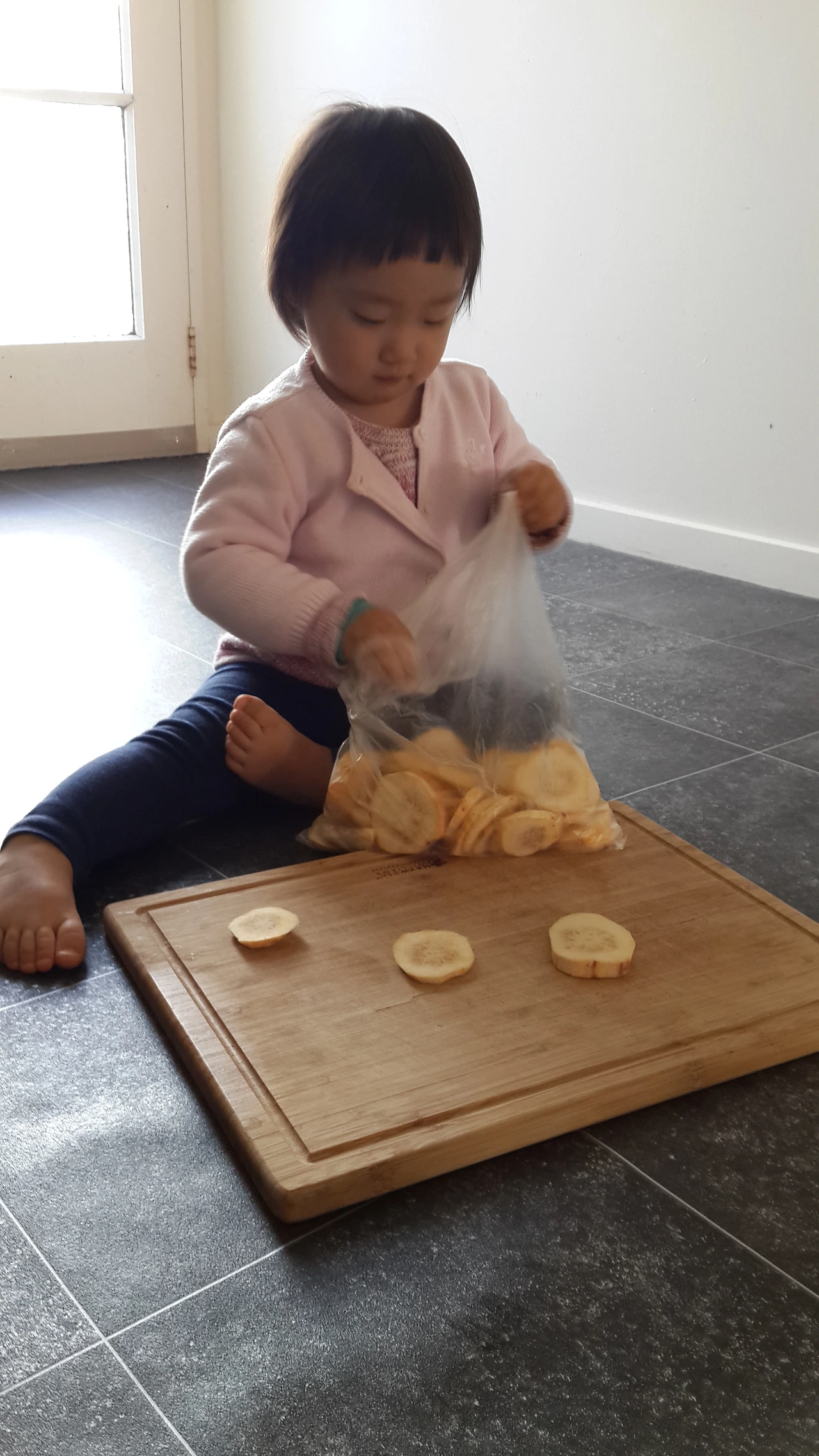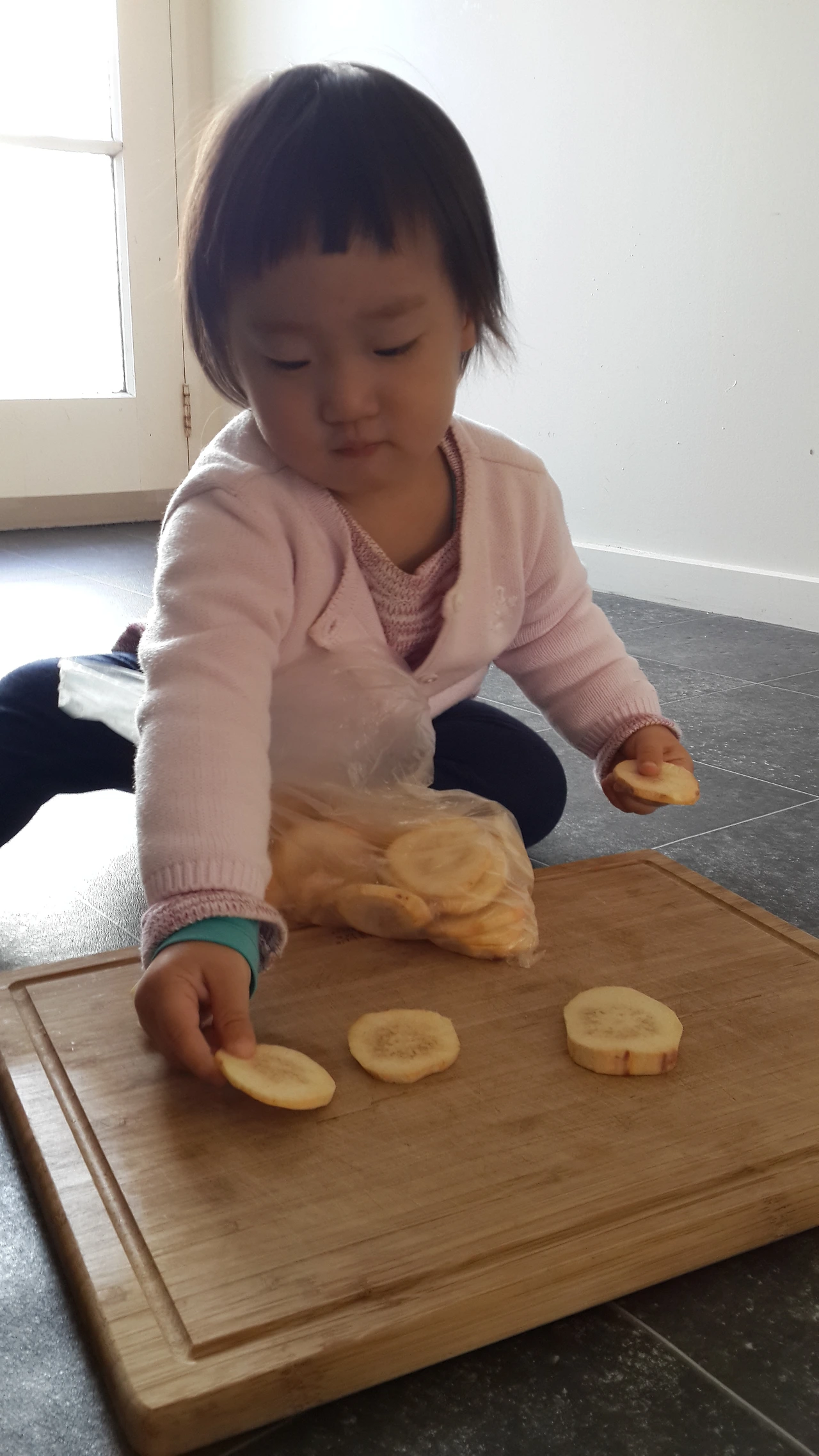 가족 모두가 고구마를 좋아한다. 시장에서 고구마를 왕창 사 와서 썰어두곤 한다. 다듬어 놓은 고구마를 빈 봉지와 함께 아이 앞에 놓으면, 봉지에 담고 다시 도마에 늘어놓길 반복한다. 30분은 거뜬하다. 도마 위에 고구마 조각을 늘어놓는 아이의 눈빛이 너무 진지해서 당혹스러울 정도.