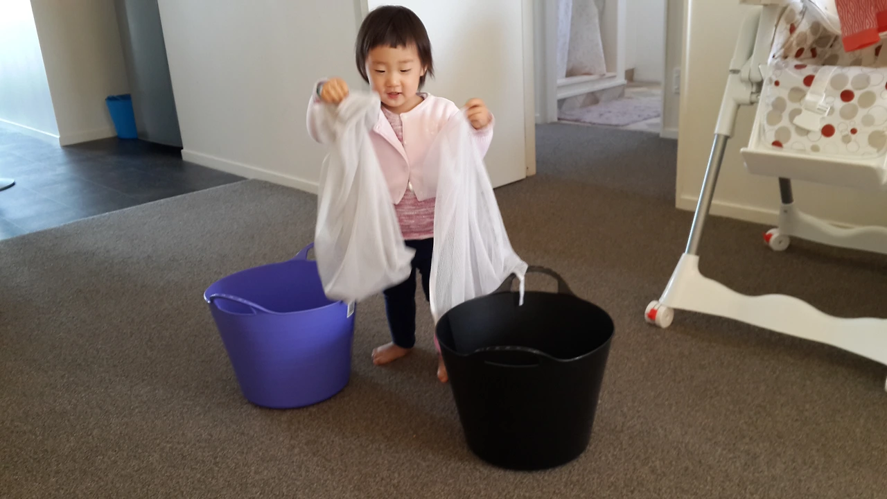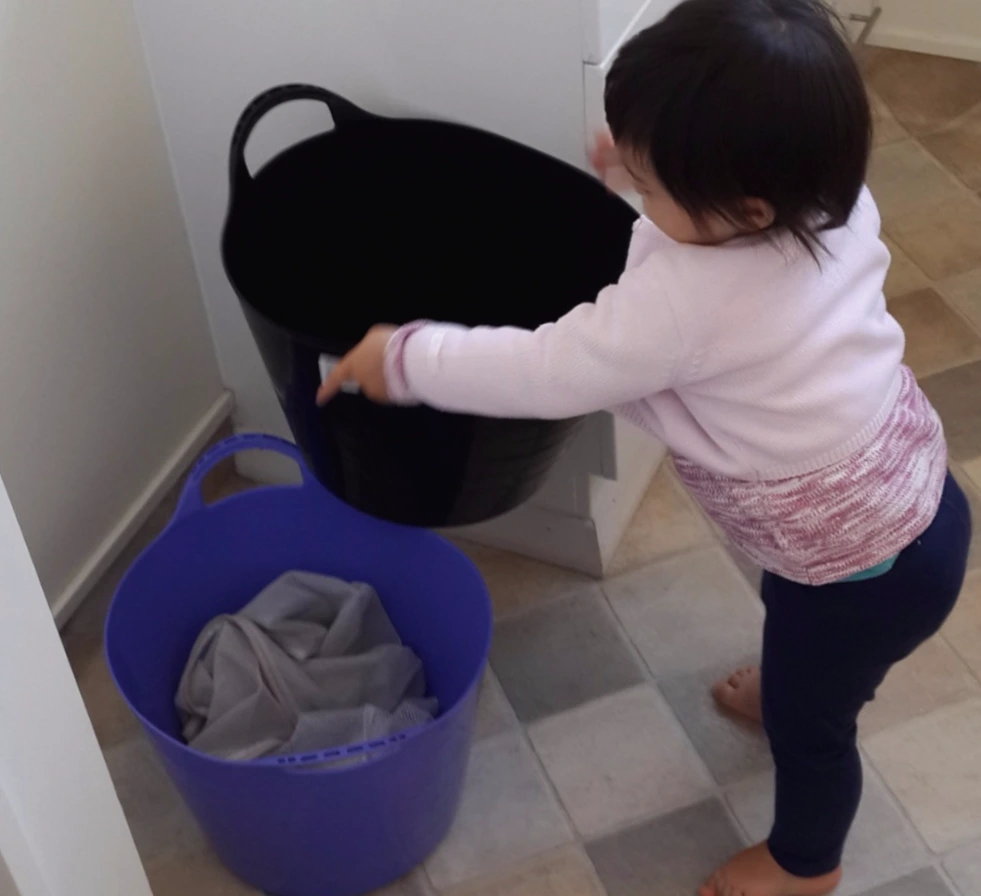 딸이 가장 자신있어 하는 살림 놀이는 빨랫바구니 옮겨주기. 마당에 빨래를 널고 아이에게 바구니를 다시 세탁기 앞에 놓아 달라 부탁한다. 딸은 아주 기꺼이 그 부탁을 들어준다. 혹 시간이 더 필요하다면 10회 정도 반복 가능하다.