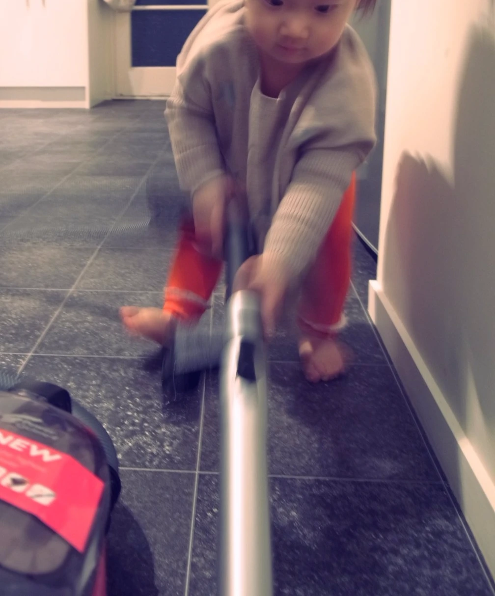 청소기를 돌리기 시작하면 딸은 정말 빛의 속도로 달려든다. 그리고는 기어이 빼앗아 든다. 앞뒤로 청소기를 미는 자세가 정말 놀라울 정도로 리얼하다. 한 1년만 더 키워서 정말 맡겨볼 참이다. 가끔 '너무 조용한데?' 싶어질 즈음은 딸은 미니 빗자루와 쓰레바퀴를 들고 나타난다. 그리곤 정말 열심히 부엌 바닥을 쓴다.