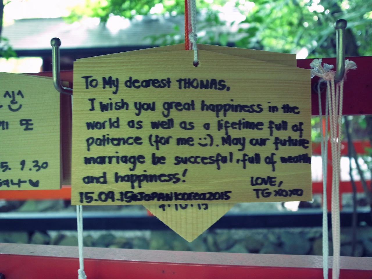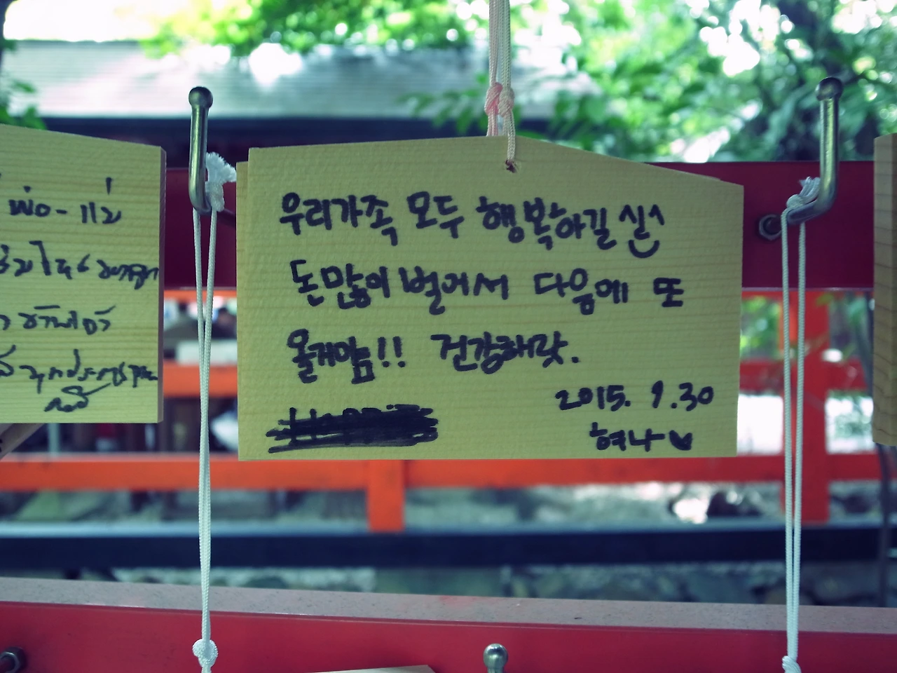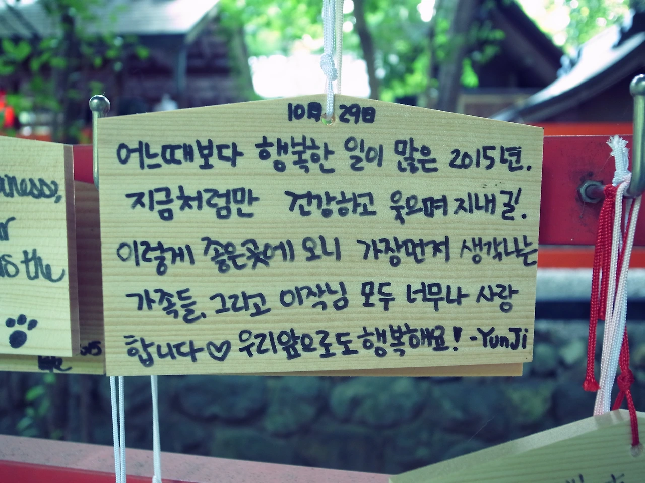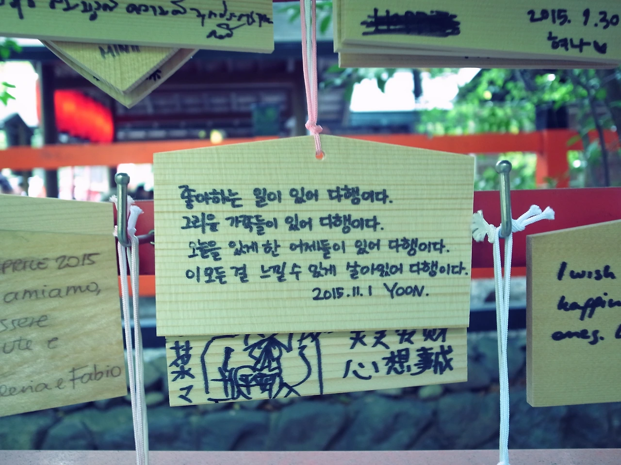 간절한 표정의 그들이 어떤 기도를 했을지 궁금했다. 신사 곳곳에 걸린 목판을 읽고 있자니 사람들이 바라는 건 크게 다르지 않다는 생각을 하게 된다. 가족의 건강과 행복. 나도 태어나 처음으로 속마음을 적어 걸었다.