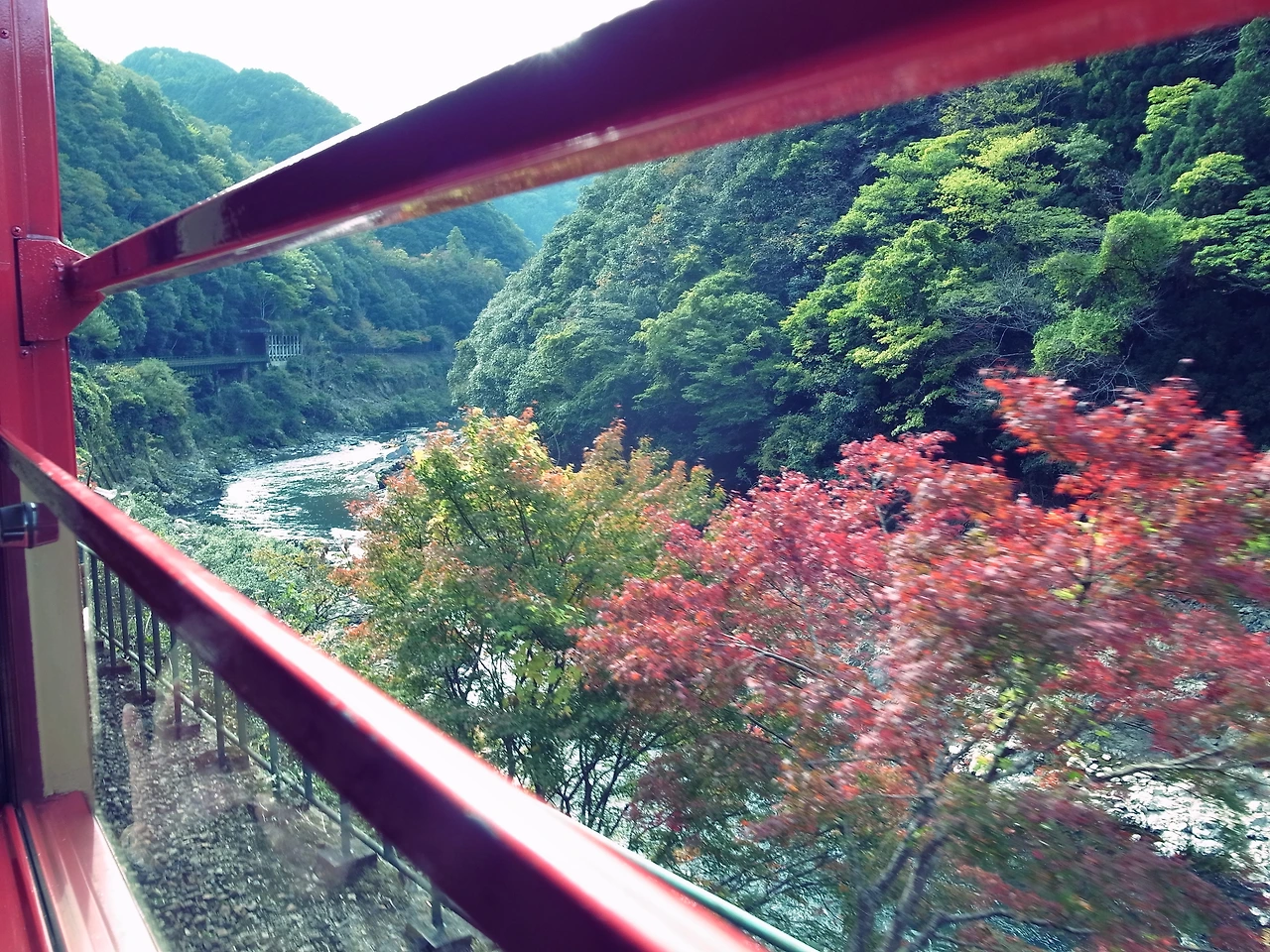 이번 여행에서 가장 좋았던 교토의 단풍 명소는 아라시야마 사가노 토롯코 열차였다. 열차의 뚜껑은 투명한 유리다. 창은 뚫려 있어 열차가 가르는 교토의 가을 바람이 숭숭- 내 머리카락을 날린다. 강줄기 너머 서서히 무르익기 시작한 단풍을 보고 있으니 마냥 좋았다. 열차를 탄 1시간, 무언가 다른 시간을 산 느낌이다.