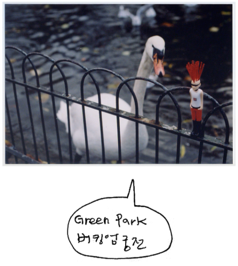 버킹엄 궁전은 런던의 대표적 관광지로 보통은 사람이 많아서 일찍 가지 않으면 근위병을 가까이서 보기 어렵다고 들었다. 그 날은 엄청나게 많은 인파가 아니었기에 나는 궁전 대문에 바싹 붙어서 안을 들여다보다가 철창 사이 틈에 톰을 세워보았다. 버킹엄 궁전을 배경으로 아슬아슬하게 서있는 톰을 찍으려고 돌아서는 순간 휙 바람이 불었다.