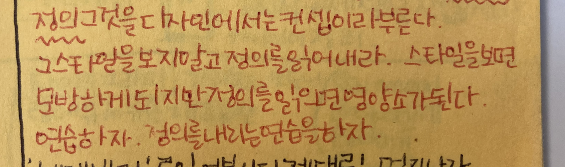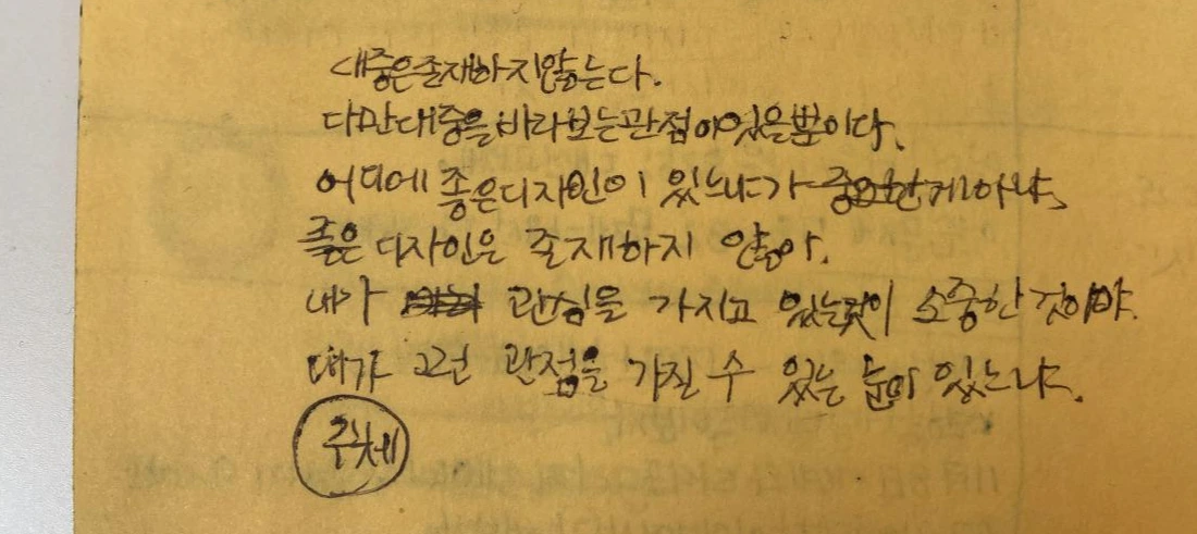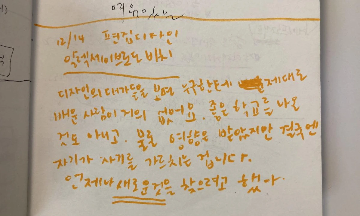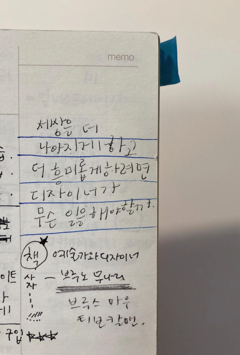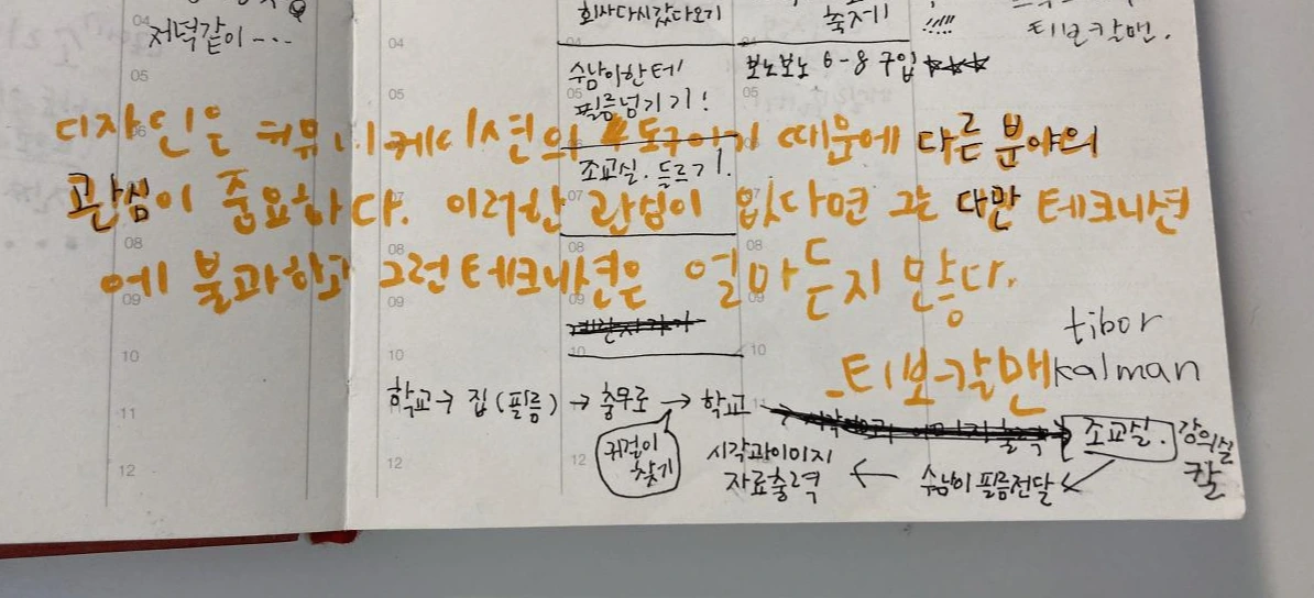 대학 시절 가장 좋아했던 디자이너, 티보 칼맨의 말입니다. 이런 말들이 그 시절 노트 곳곳에 적혀 있습니다. 뭐가 됐든 나는 디자인으로 세상을 더 나아지게 하고 싶다는 강렬한 욕망에 사로잡혀 있었나 봅니다. 딱히 할 줄 아는 것은 없었지만 누구에게도 지지 않을 정도로 드높은 이상만큼은 가지고 있었죠.