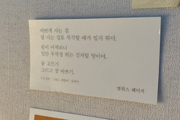 춘천에서 올해의 마지막 글을 씁니다. 한 해를 돌아보고 잘 마무리하고 싶어서 가까운 곳으로 떠나왔거든요. 창밖으로는 춘천 시청이 내려다보여요. 시청을 향해 걸어오는 사람들도 보이네요. 서울을 벗어났을 뿐인데 시간이 조금은 천천히 흐르는 기분입니다. 숙소의 벽면에는 이런 문구가 붙어있어요.