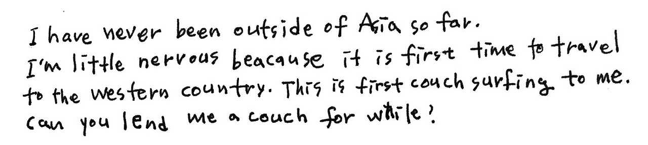 호스트의 프로필을 꼼꼼하게 읽고, 레퍼런스(게스트가 남긴 리뷰)를 하나하나 살피면서 '만나서 이야기해보고 싶다, 친구가 되고 싶다'고 생각되는 사람들에게 카우치를 요청했다. 내 프로필에는 재미있는 사진을 잔뜩 올려놓고 '나 나쁜 사람 아니야. 나 엄청 웃겨'라는 이미지를 주려고 애썼다. 결국 떠나기 직전 2명의 호스트가 내 카우치 요청서를 수락해주었다. 수락 메시지를 받았을 때의 기쁨이란!