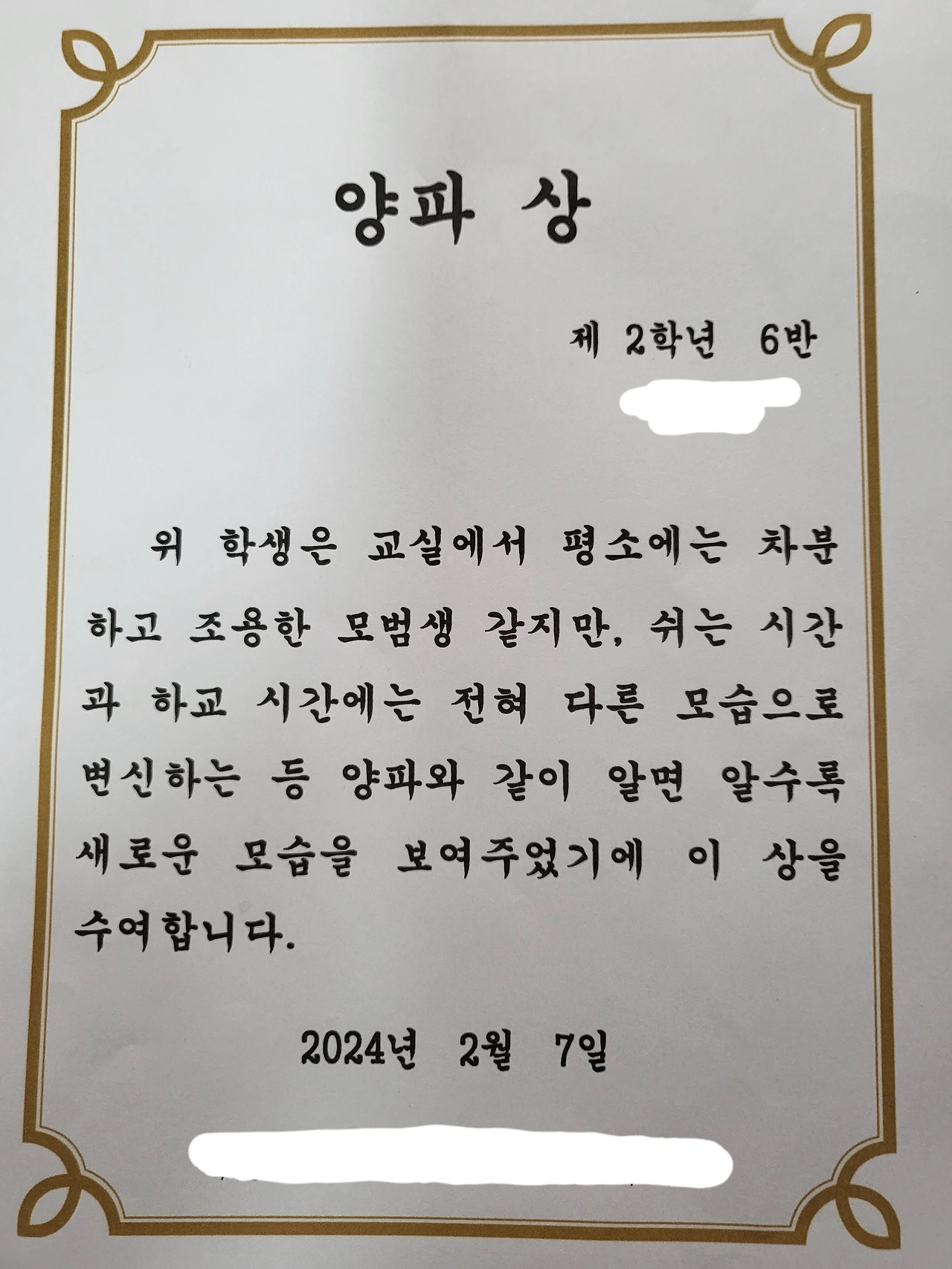 셋째가 담임선생님께서 따로 준비 비해주신 상장을 하나 받아왔다.