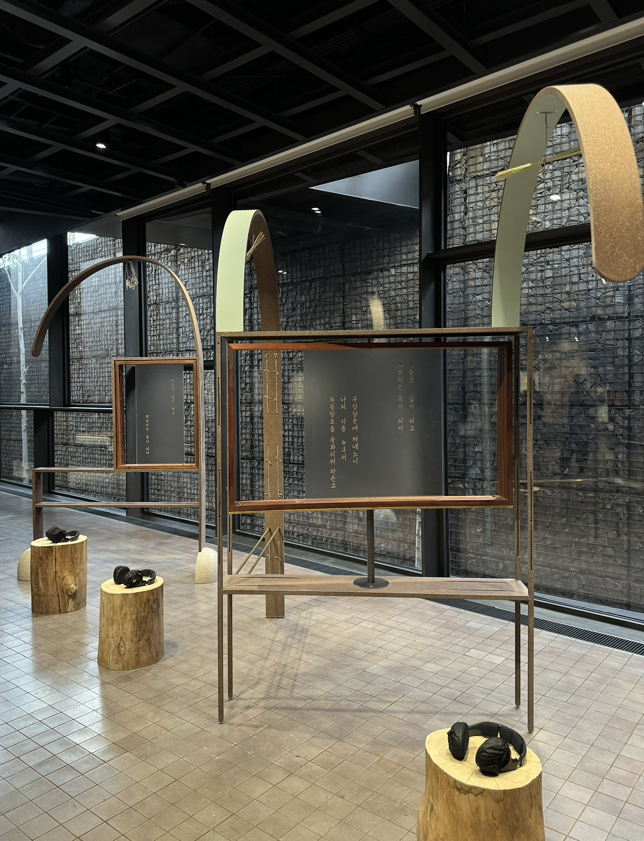 앞에 마련되어 있는 나무 둥치에 앉아서 그 둥글고 사각진 빈 공간을 들여다본다. 반투명하게 떠오른 시어들은, 예컨대 “버들은 실이 되고 / 꾀꼬리는 북이 되니” 하며 이어지는 시는, 달과 산과 강아지 짖는 소리, 버들과 꾀꼬리와 시름을 이야기한다. 그 앞에 앉아 이미지들을 곱씹고 어떤 고요하고 시적인 시공간을 상상하면서 가만히 나뭇가지들이 흔들리는 것을 본다.