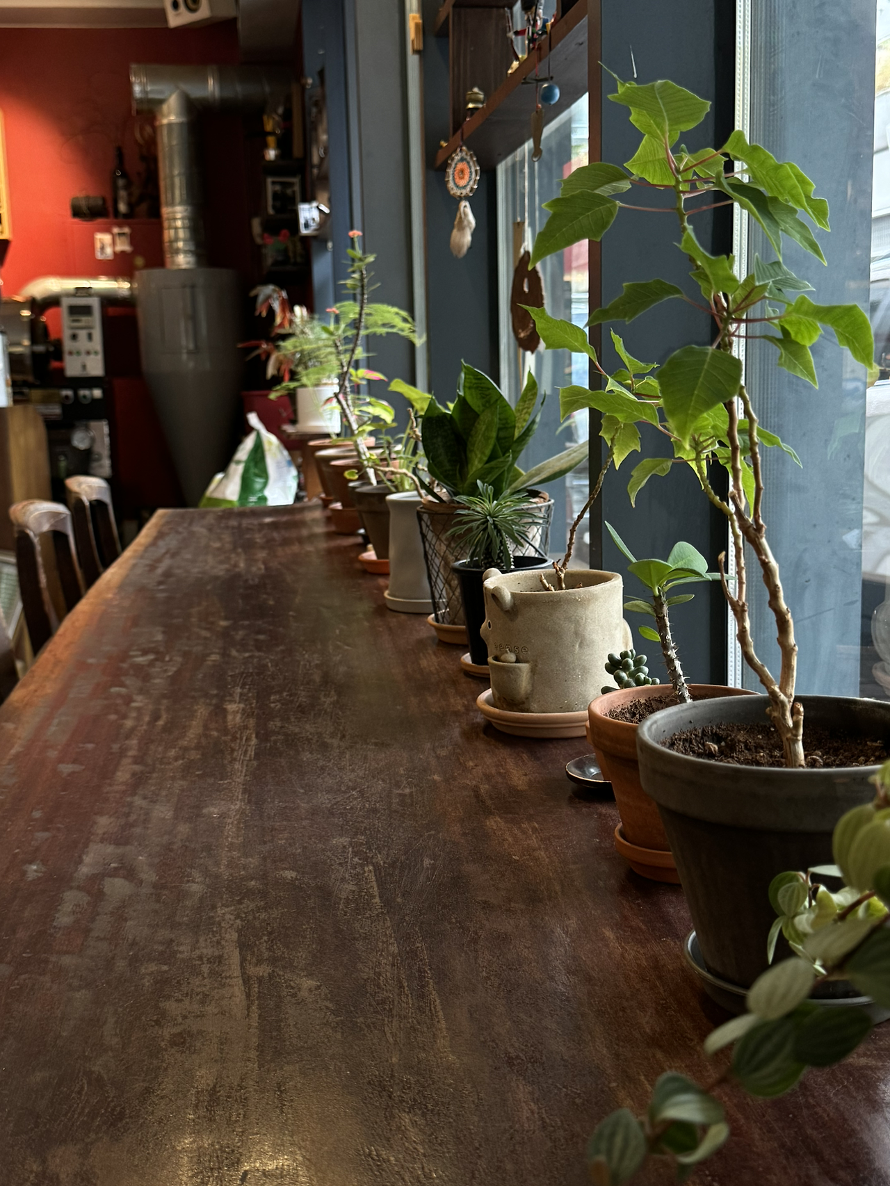오늘은 그래서, 카페에 와 빗방울이나 행인들이나 식물들을 응시하고 있다. 내수동의 오래된 이 카페에는 건강하고 생기있는 화분들이 가득한데, 그 중 큰 것들은 카페 중앙 테이블에 일렬로 놓여, 각기 다른 녹색으로 넓은 잎, 긴 잎, 줄무늬, 얼룩무늬의 잎들을 뻗어내며 서 있다. 창가에는 보다 작은 화분이 귀여운 리듬을 만들어내며 줄지어 있다. 이 카페에는 모든 것이 가로로, 세로로 규칙적인 듯 불규칙하게 늘어서 있다. 커피포트가, 머그가, 유리컵이, 만화책이, 문학과 인문 서적들이, 작은 소품들이.