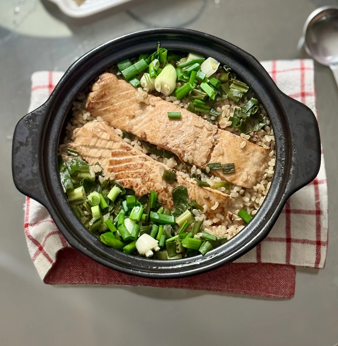 저녁 시간이 가까워온다. 드디어 이 모든 것을 한데 조합할 시간이다. 나는 배춧국용 채수를 끓이는 동안 연어를 프라이팬에 살짝 굽고 뚝배기에 쌀과 물을 1:1 비율로 넣는다. 물이 끓어오를 즈음 앞뒤로 구운 연어를 밥 위에 놓고 뚝배기 뚜껑을 닿는다.