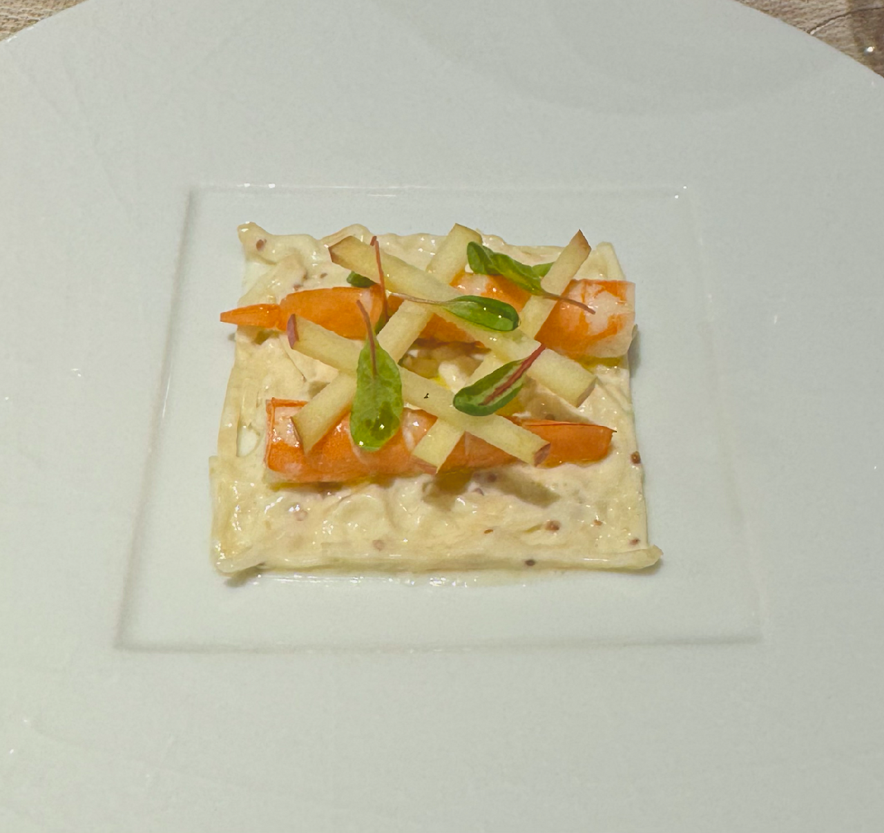 태이블에는 둥근 와인잔이 놓인다. 술이 채워진다. 굽이 높은 사각 도자 그릇에 아무르 부슈가 놓인다. 곧이어 상큼하고 부드럽게 입맛을 돋우는 전채 요리가 나온다.
