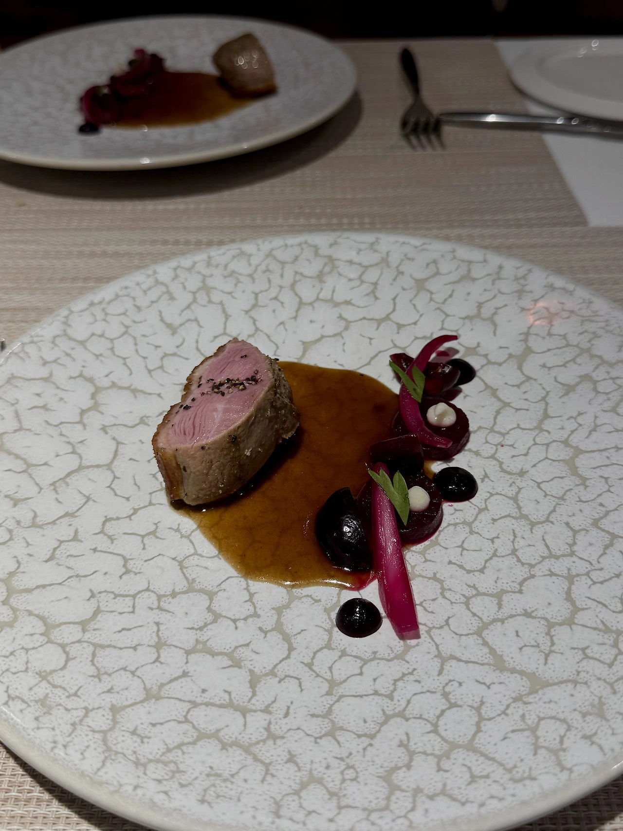 지배인은 넓고 흰 플레이트를 두 사람 앞에 놓는다. 접시에는 둥근 오리구이 한 점과 짙은 보랏빛 야채가 놓여 있다. 포크 끝으로 소스를 찍어 먹어 본다. 곧이어 날카로운 나이프로 고기 한 점을 썰고 소스를 발라 입에 넣는다. 비트와 체리 가니시를 맛보고, 가니시 위에 올라온 머랭 모양의 흰 소스를 다시 뜬다. 음식의 기억이 떠나기 전에 와인을 곁들인다.