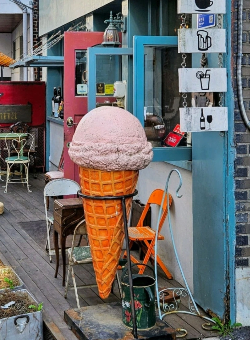 입구부터 예사롭지 않은 기분이 들었다. 똑바로 세워진 아이스크림 콘과 엎어져 녹아내린 콘 모양의 대형 조형물이 출입문의 양 옆에 서 있고 그 옆으로는 녹슨 자전거, 원예용 물 주전자, 철제 벤치, 곡선형 의자들이 나름의 규칙으로 어지럽게 배치되어 있었다. 검은 나무 간판에는 금색 필기체로 '알키미스트' 라고 쓰여 있었다.