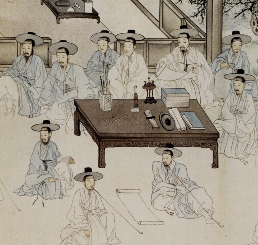 각 인물들은 누구인가? 지금 무엇을 하고 있는 거지? 여기는 어디일까? 이 모임은 누가 열었을까? 이 사람들은 지금 즐거워하고 있나, 지루해하고 있나.