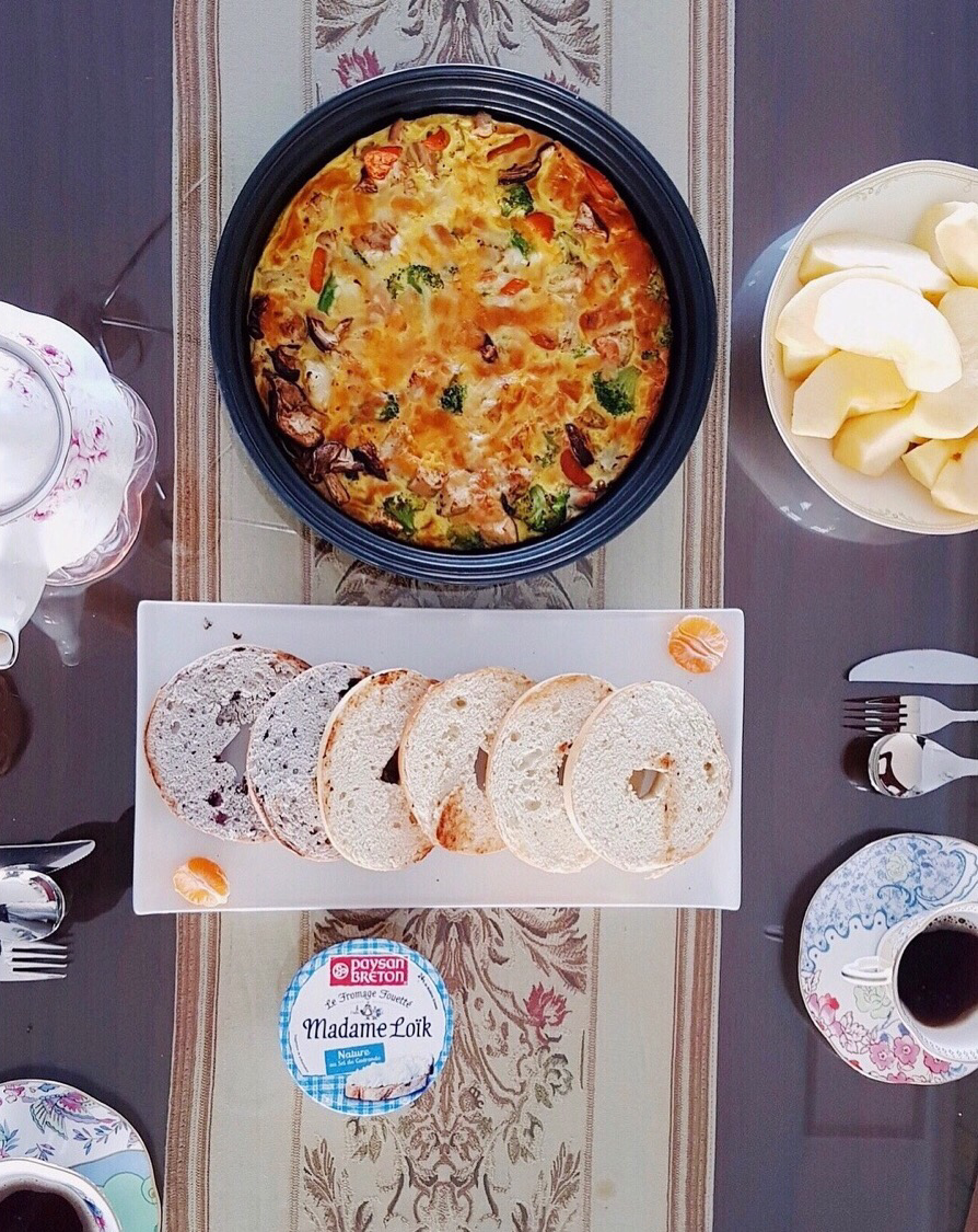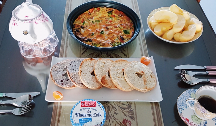 용기가 얇았던 터라 혹시나 타지 않을까 오븐 앞을 계속 기웃거리면서 한 편으로는 베이글을 반으로 잘라 바삭하게 익혔다. 베이글에 발라 먹을 루악치즈를 꺼내고 에스프레소 커피를 내리고, 테이블을 세팅했다. 이 때가 제일 즐겁다. 플레이팅을 할 때 말이다. 프리타타를 기다리는 김에 테이블 가운데에 장식으로 놓은 식탁보도 다른 것으로 바꿨다. 계란이 구워지는 향기가 부엌으로 몽실몽실 퍼져온다. 먹음직스럽다. 장갑을 끼고 꺼내보니 딱 알맞게 되었다. 오믈렛처럼 부드럽지만 단단하고 담백한 맛이 있는 프리타타. 다들 맛있게 다 비웠다.