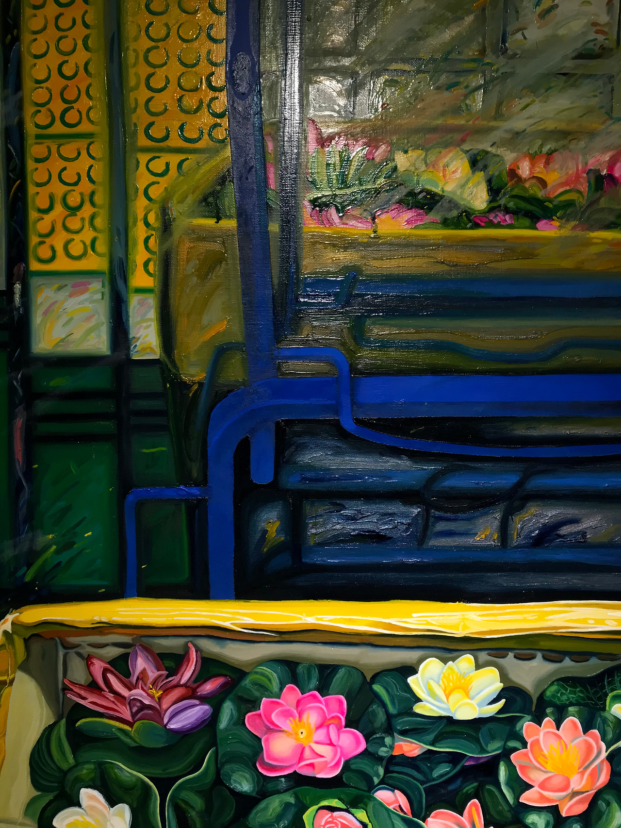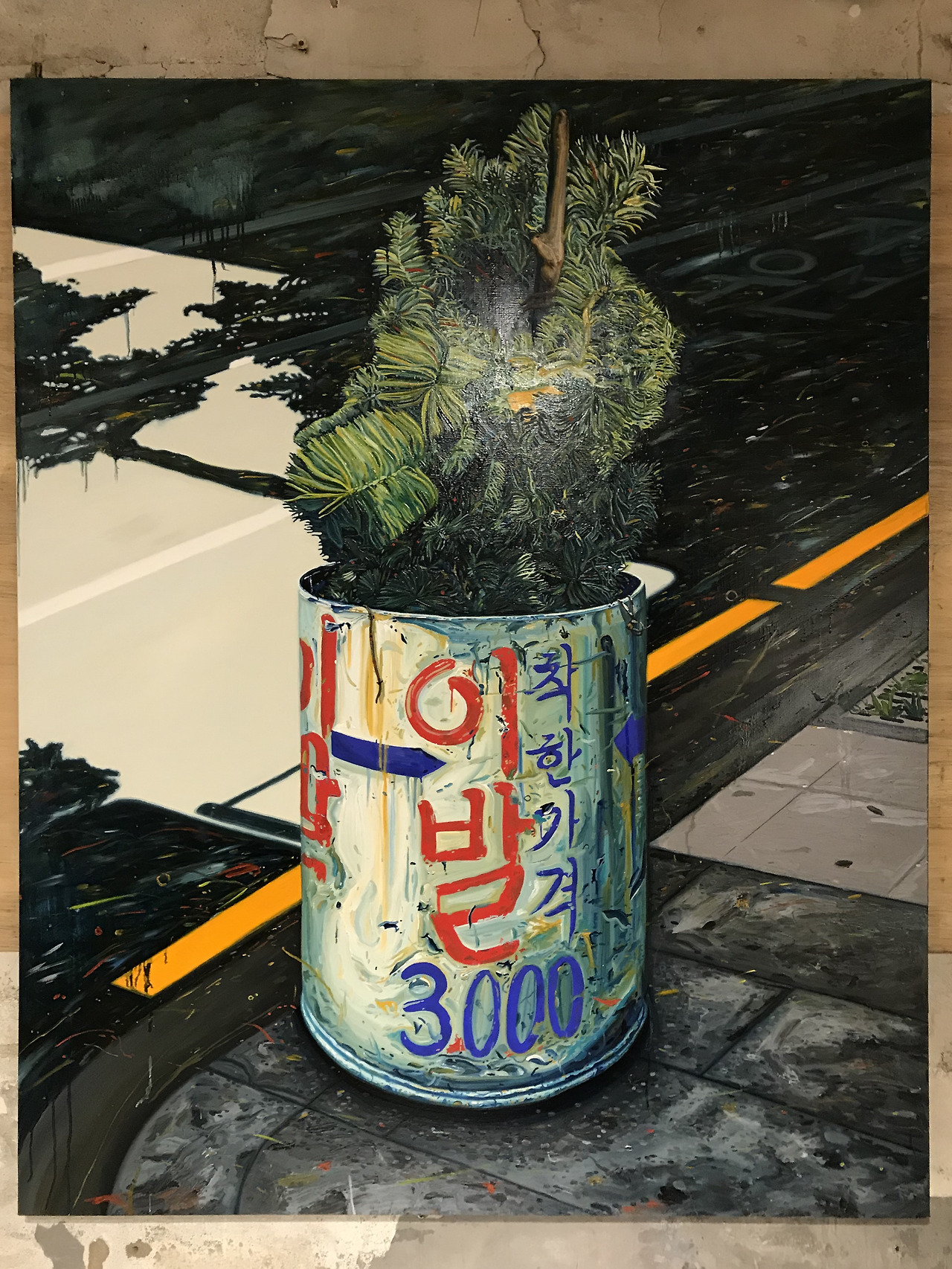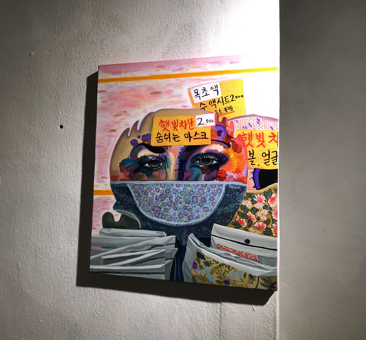 작가는 비비드한 원색과 형광색 유화물감을 쌓아 올려 이들을 그려내고, 색채는 침윤되지 않은 채 각자 요란하게 두드러진다. 또 화면에는 빗물이나 노이즈, 깡통의 긁힌 표면처럼 어떤 흐름과 이물질들이 산재되어있다. 이를 통해 형상으로 환원되지 않는 시장의 소리와 분위기가 가득 울린다.
