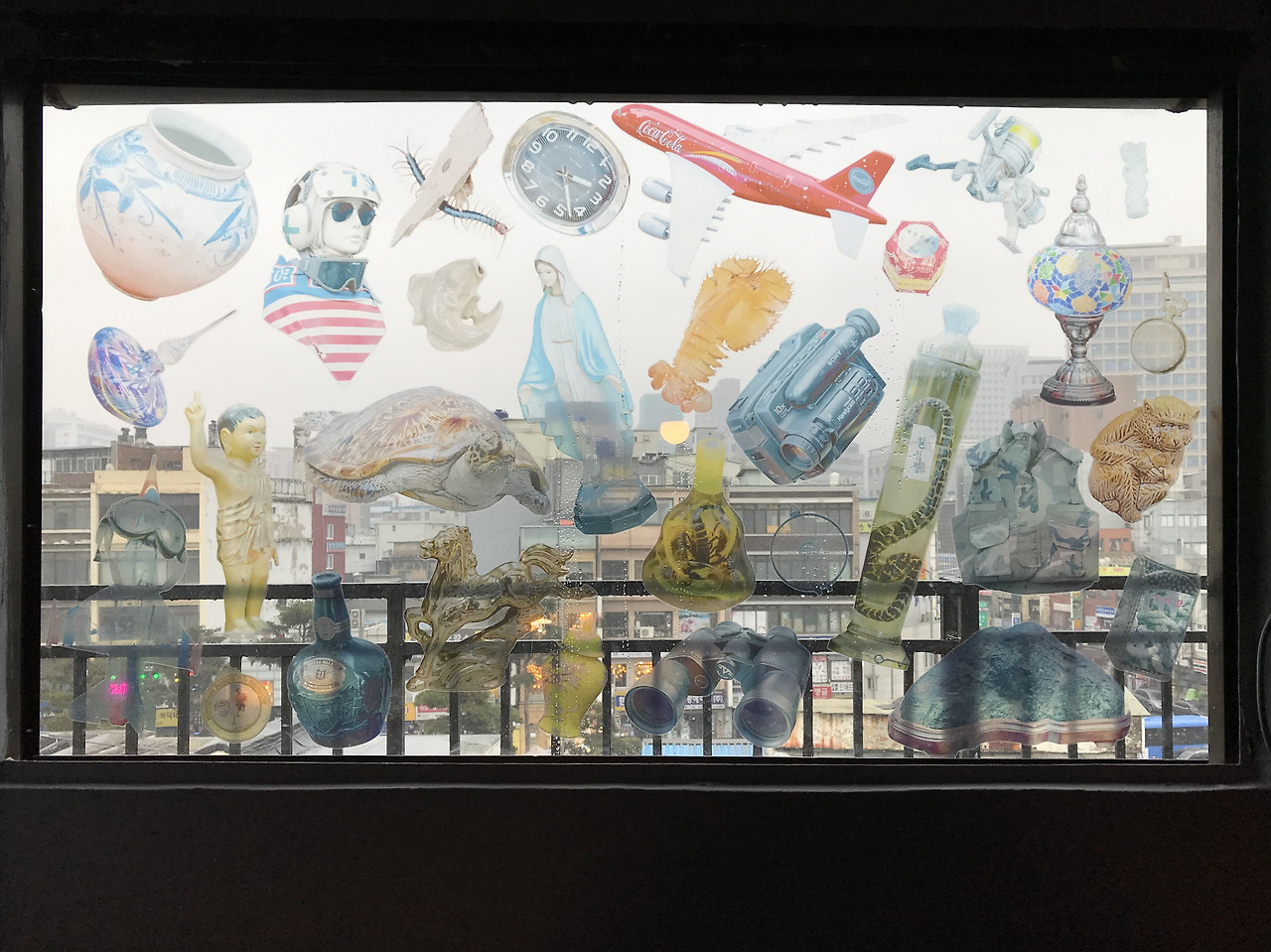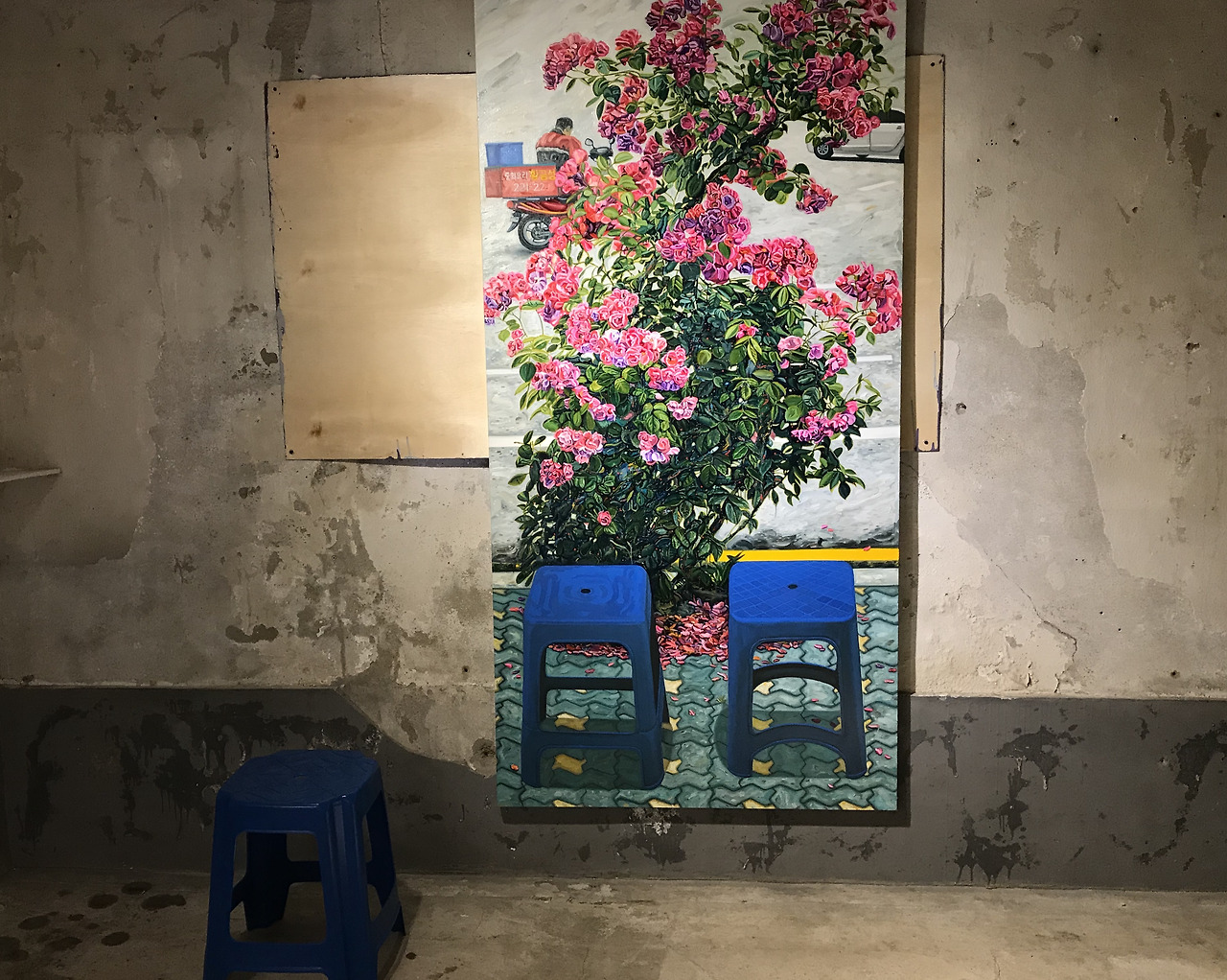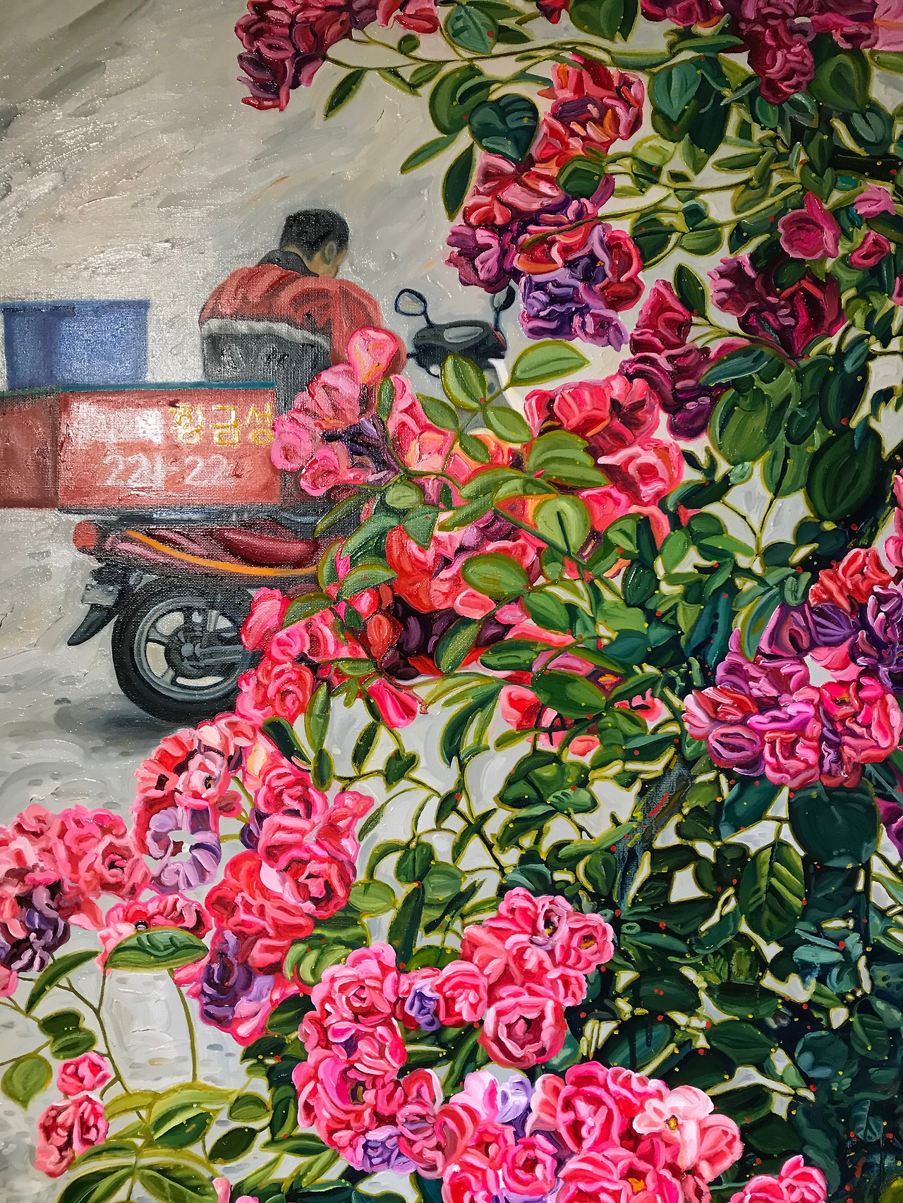 박지원은 을지로 시장을 걸을 때 눈과 귀 피부에 스며드는 온갖 감각들을 캔버스 안에 집약적으로 담았다. 동네의 느낌이 한껏 묻어나는 대상들이 화면에 그려진다. 이발소 홍보 간판으로 변모된 깡통 화분과 그 안에 심겨진 가꿔지지 않은 나무, '중화요리 황금성'이라는 전형적인 이름을 단 배달 오토바이, 길에 자라는 촌스러운 분홍색 꽃, 새파란 플라스틱 의자와 리어카, 70년대 가발 공장에서 쓰였을 법한 마네킹과 꽃무늬 마스크, 치마 걸이에 걸려있는 종이 성화, 조악한 마리아상, 십이간지가 그려진 컵 받침. 이들은 허례의식이나 미화는 고려 사항조차 아니라는 듯, 이곳에서 최적으로 생겨난 것들이자 기능성에 충실한 대상들이다.
