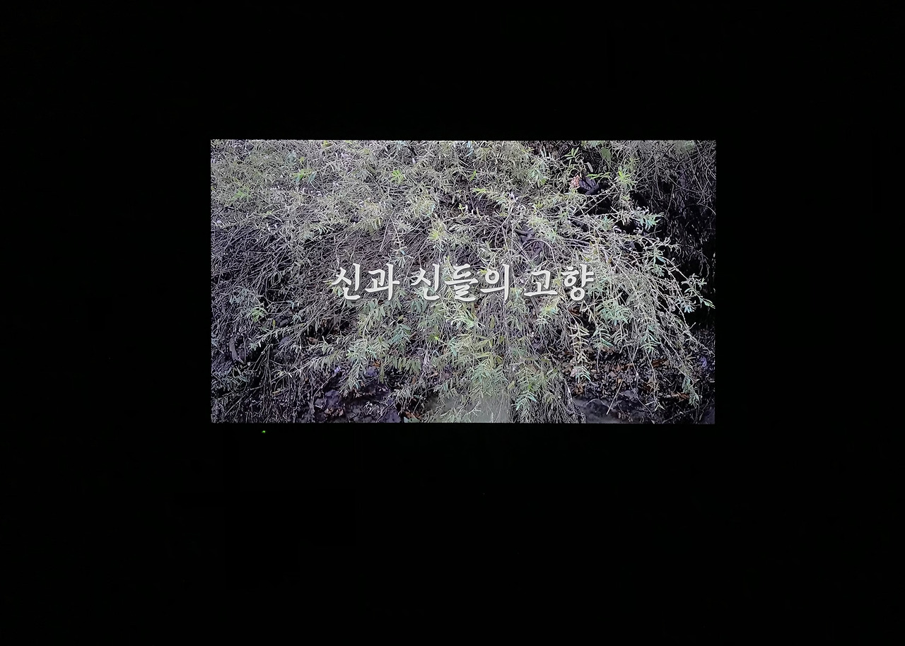 한편 오제성의 영상작업에서는 을지로 시장에서 판매되는 온갖 플라스틱 성물들로 한바탕 우스꽝스럽고 기이한 종교 의식이 벌어진다. 영상 초반, 가꿔지지 않은 들풀과 나무 위로 '신과 신들의 고향'이라는 제목이 B급 감성의 폰트로 떠오른다.