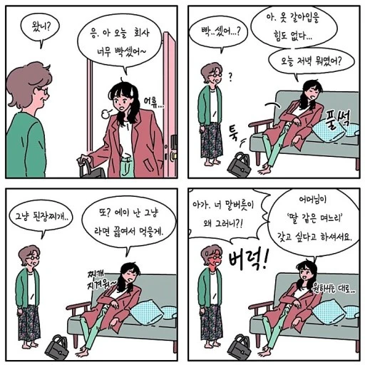 실제 딸들은 이 삽화보다 더하면 더했지 덜하진 않을텐데. 흔히 시부모님이 말하는 딸같은 며느리는 어떤 모습일까. 말 잘 듣고, 잘 챙겨드리고, 싹싹하고, 집안일 잘하는 깍듯한 며느리? 시부모님이 좋아하는 모습만 보이기위해, 불편하고 힘들어도 참는 노력을 '딸같다.'는 말로 표현하는게 맞을런지.