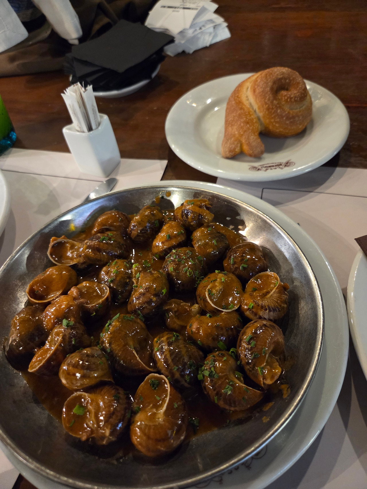 이 집의 명물 달팽이와 달팽이 빵을 시키고, 또 하나의 명물 통닭을 시켰다.