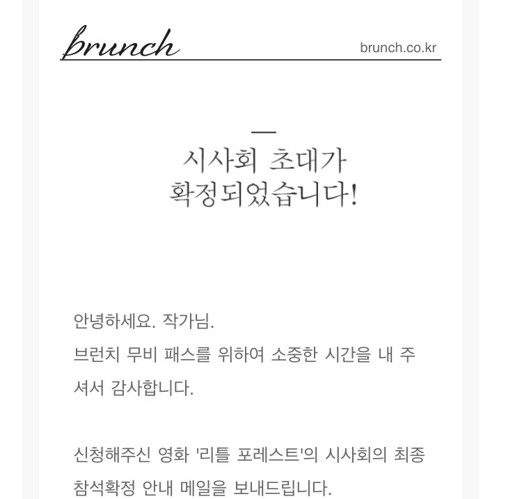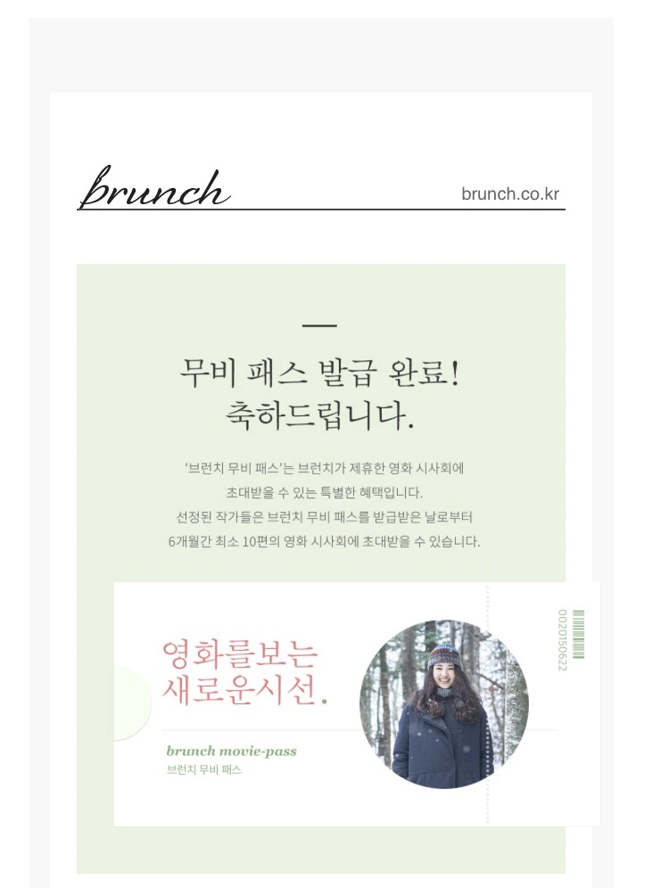 브런치와는 인연이 많은가 보다. 감사하게도 브런치 무비 패스 3기 작가에 선정이 되었다. 첫 번째 영화로 볼 영화관도 집에서 엄청나게 멀다. 그냥 저녁에 짧은 여행을 간다는 마음으로 막히는 서울시내 운전보다는 지하철을 선택하고 읽고 싶은 소설을 가방에 넣었다. 6개월 동안 이렇게 설레는 초대장은 나에게 계속 올 예정이다.