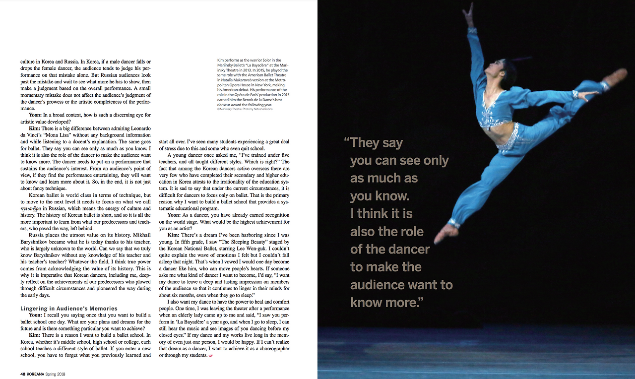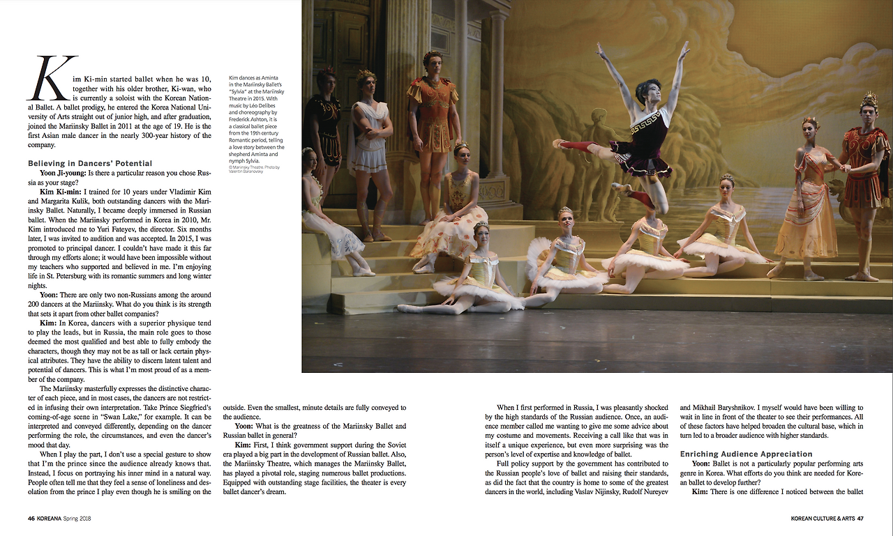 외교부 산하에 있는 한국재단에서 발행하는 계간지 <코리아나>의 인터뷰에 김기민 발레리노의 기사가 실렸습니다. 코리아나 계간지는 8개 국어로 번역되어 각 나라에 문화예술을 공유하는 목적으로 배포됩니다. 예전에 브런치에서 했던 김기민 발레리노와의 인터뷰 기사의 계기로 제가 인터뷰어가 돼서 새롭게 기획을 했습니다. 한글판 홈페이지가 업데이트되면 한글판 링크도 함께 첨부하겠습니다.