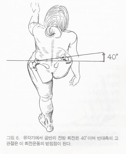 누구나 걷는다. 그리고 가르쳐주지 않아도 같은 팔, 같은 다리가 나가지 않고, 대각선으로 엇갈려 걷는다는 것은 전부 알고 있는 사실이다. 왼쪽 발이 앞으로 나갈 때 자연스럽게 오른팔이 나가고, 오른발이 앞으로 나갈 때 왼쪽 팔이 나간다. 보행 중에 허리를 꼿꼿이 세우고 가슴을 펴고 걸어야 한다는 것도 알고 있다. 이 자연스러운 보행 가운데 인간의 골반은 상당히 정교하게 전방 40도 한도 내에서 모멘트(회전)가 발생한다. 어렵게 생각할 필요 없다. 우리가 지극히 자연스럽게 걸을 때 우리 몸 안에서는 알아서 이 회전이 세팅이 되어 있는 것이다.