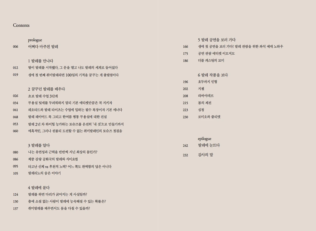 2016년 제2회 브런치북 프로젝트에서 금상을 수상하면서 그 해 10월에 <어쩌다 마주친 발레>가 출간되었습니다. 지금까지는 인터넷에 올린 모든 글을 공개했지만, 책이 출간된 지 2년 여가 지난 시점인 지금에서 출간 목차와 샘플 원고 몇 개 만을 공개합니다.