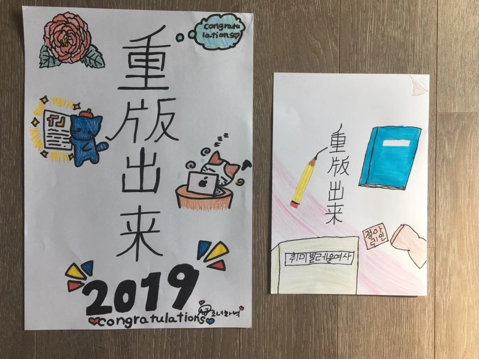 그리고 재미있게 드라마를 본 아이들에게 부탁을 해서 엄마 출판사 잘돼게 중판출래(쥬한슛타이, 重版出来)를 써달라고 했다. 큰 아이는 말로 대신하고 ㅎㅎ, 둘째, 셋째는 자신들의 느낌대로 작품을 선물해줬다.
