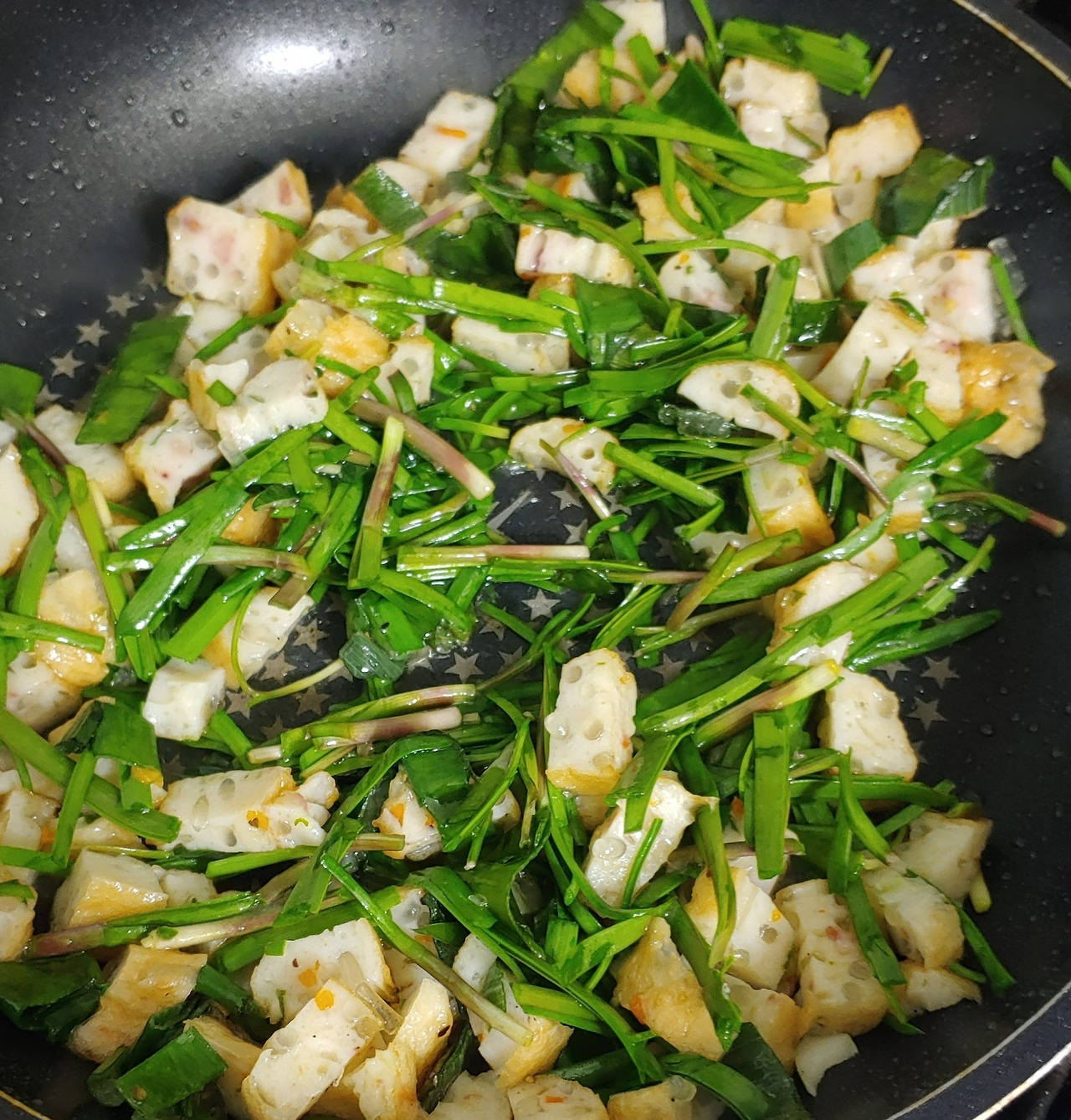 그리고 어묵을 넣고 볶다가 부추를 넣고 또 볶다가