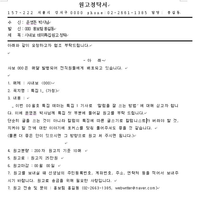 직장생활을 하다 보면 칼럼을 쓸 일이 생긴다. 기본적인 문장력과 간단한 요령만 익히면 누구나 쉽고 빠르게 쓸 수 있는 글이 칼럼이다. 칼럼을 잘 쓰는 방법은 칼럼의 특성을 파악하는 데 있다. 세상에는 기업이나 공공기관에 엄청난 사보가 있고, 그곳을 채워야 하는 콘텐츠가 필요하다. 신문에 칼럼을 쓰는 것은 기고라면 신문 독자층이 어떤지 알고 써야 한다. 대표적 칼럼은 한국경제신문의 '천자 칼럼', 동아일보의 ‘횡설수설’, 한겨레의 '세상 읽기', 조선일보의 ‘만물상' 등이 있다. 칼럼 시장은 월간호든 계간호든 일정하게 발행하는 잡지나 사보가 많다. 그리고 그곳에는 칼럼을 실어야 한다. 물론 옛날에는 인쇄를 하는 경우가 많았지만 요즘은 인터넷으로 웹진이 많아지고 있다. 칼럼의 분량은 얼마인가? 보통 분량은 원고지 10~15매 정도이고 A용지로는 1장 반~2장 사이이다. 글자 크기는 10pt이고 줄 간격 160%이다. 칼럼 원고료는 얼마인가? 발행하는 곳에 따라서 다르다. 특히 대행사를 낀 경우는 원고료가 짜다. 200자 원고지 매당 1만 원 선으로 보통 15 매라면 15만 원이다. 직접 연결하는 경우 회사가 좋은 곳이면 칼럼당 25만 원~ 30만 원을 받기도 한다. 보통 의뢰하고 1주일에서 많게는 2주일 사이로 칼럼을 의뢰한다. 물론 마감일에 맞게 보내는 것보다 좀 더 일찍 보는 것이 좋다. 그래야 수정도 원활하고 잡지를 내는 곳은 시간에 쫓기는 경우가 많기 때문이다.