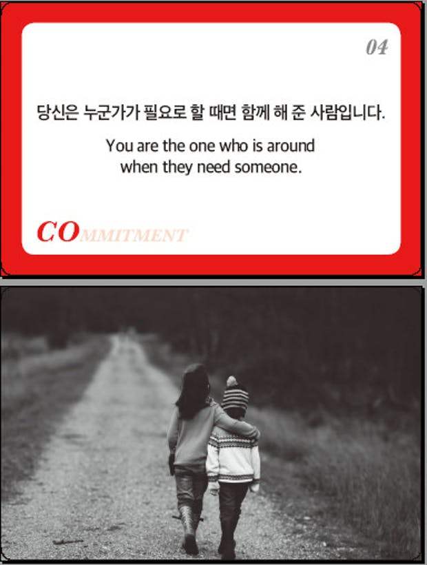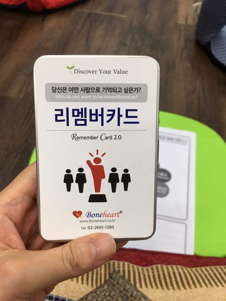 주입식 공부머리에서 벗어나 일머리로 뛰는 핵심인재로 거듭나기 위한 워크숍! 본하트 리멤버카드는 당신이 어떤 모습으로 기억되기를 바라는지 알게 함으로써 가치와 동기 등이 통합된 접근으로 교육, 코칭, 회의, 등에서 사용하실 수 있습니다.