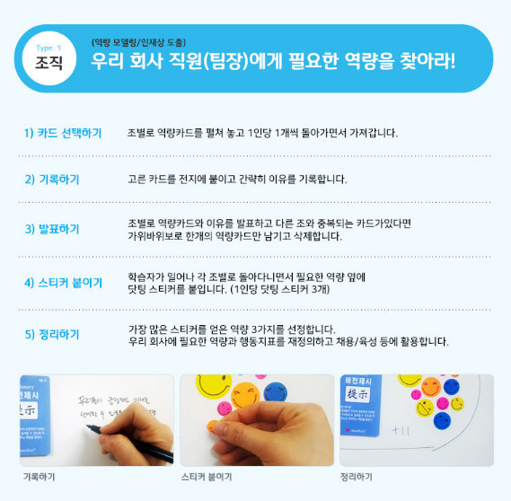 5) 정리하기 - 가장 많은 스티버를 얻은 역량 3가지를 선정합니다. 우리 회사에 필요한 역량과 행동지표를 재정의하고 채용/육성 등에 활용합니다.