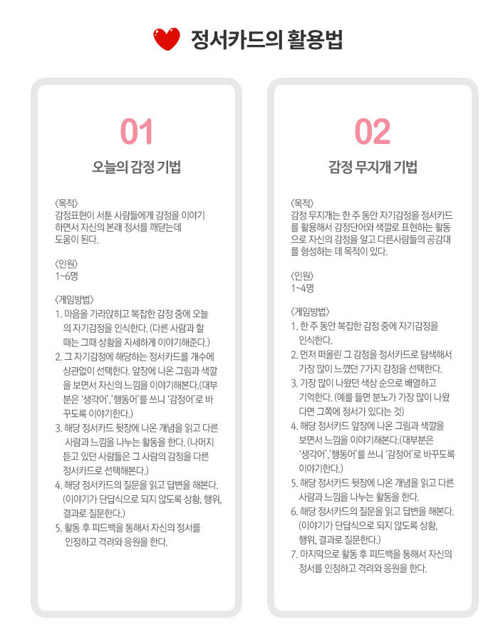 교육에 있어 가장 중요한 것은 정서입니다. 앞으로 우리가 사는 세상은 지금보다 훨씬 변화가 많을 것입니다. 정서 함양이 되도록 도와줘야 합니다. 기존 감정카드에 비해서 우선 청소년이 알기 쉬운 단어를 사용했고, 청소년 정서를 알아볼 수 있도록 텍스트로 작업되어 있어서 활용도가 높습니다. 본하트 정서카드를 통한 교육이나 코칭을 실제 진행해보았을 때 만족도 높았습니다.