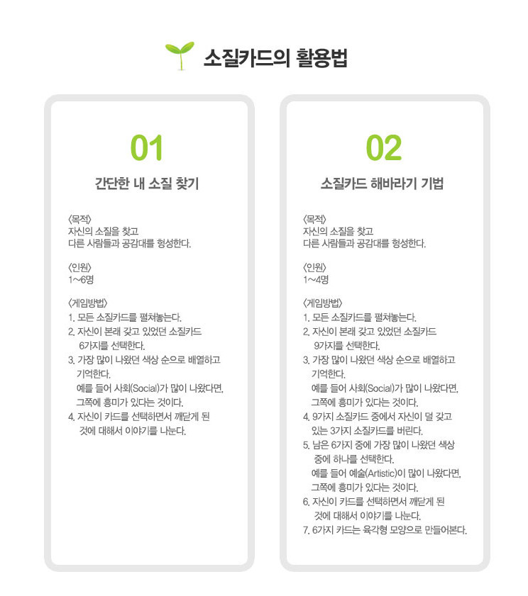 커리어코칭에 있어 직업보다 중요한 것은 소질입니다. 앞으로 우리가 사는 세상은 지금보다 훨씬 다양한 직업이 생겨나고 없어질 것입니다. 다양한 것을 체험하고 느끼며 ‘무엇을 하겠다’보다, ‘내가 무엇을 잘하는구나’와 같은 ‘소질’을 발견할 수 있게 도와줘야 합니다. 성인용 역량카드에 비해서 우선 청소년이 알기 쉬운 단어를 사용했고, 청소년 흥미과 기질 등을 알아볼 수 있도록 뒷면에 직업이 연결되어 있어서 활용도가 높습니다. 소질카드를 통한 진로지도는 실제 진행해보았을 때 만족도 높았습니다.