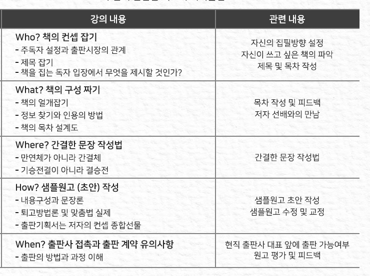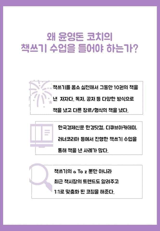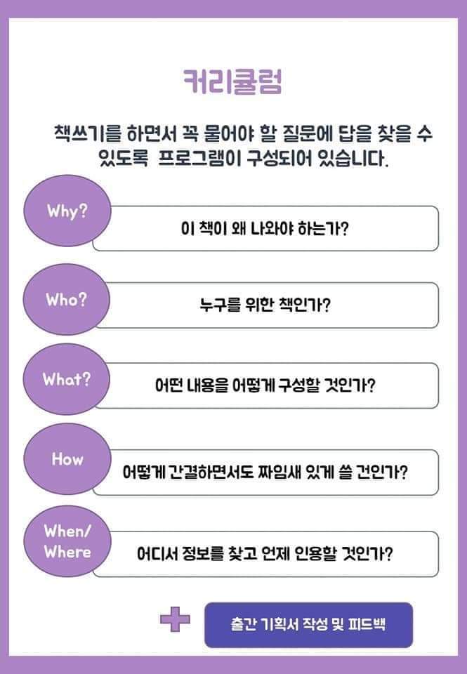 – 대부분 ‘책을 쓰고 싶다’라는 바람에서 그치고 맙니다. 올해 직장인들의 버킷리스트 내 책쓰기를 이루게 해드립니다.