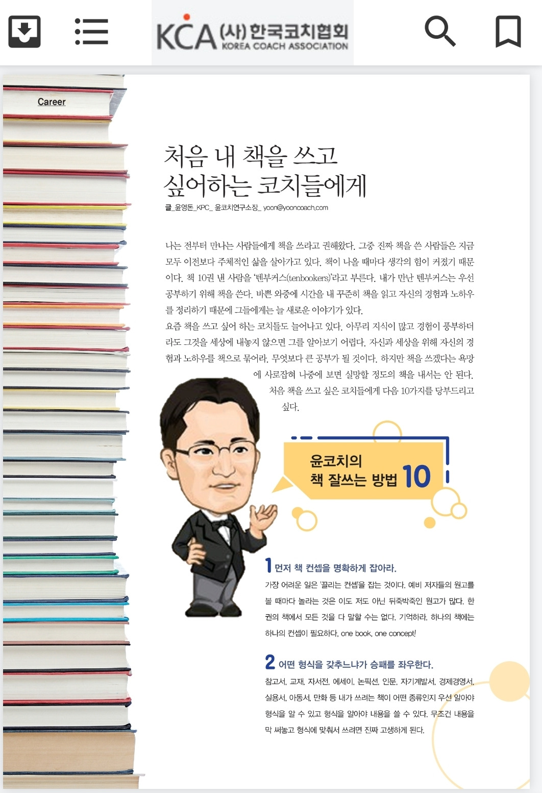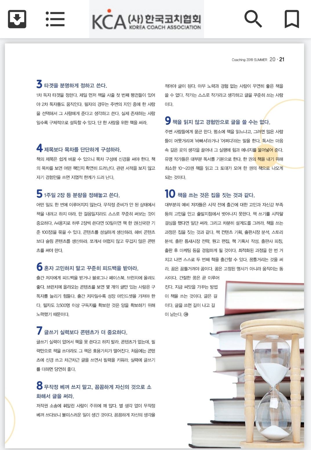 요즘 책을 쓰고 싶어 하는 코치들도 늘어나고 있다. 아무리 지식이 많고 경험이 풍부하더라도 그것을 세상에 내놓지 않으면 그를 알아보기 어렵다. 자신과 세상을 위해 자신의 경험과 노하우를 책으로 묶어라. 무엇보다 큰 공부가 될 것이다. 하지만 책을 쓰겠다는 욕망에 사로잡혀 나중에 보면 실망할 정도의 책을 내서는 안 된다. 처음 책을 쓰고 싶은 사람들에게 다음 10가지를 당부드리고 싶다.