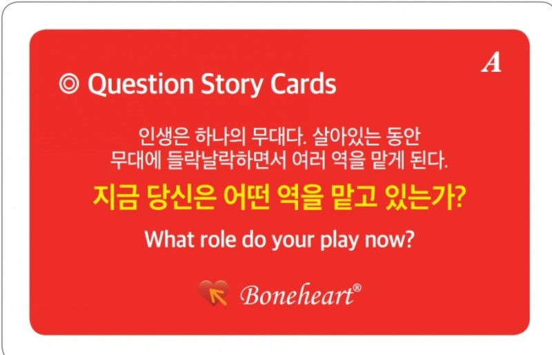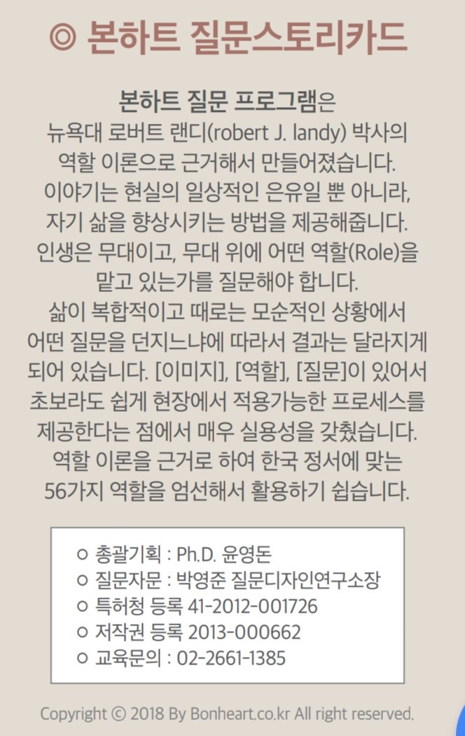 로버트 랜디(Robert J. Landy) 교수의 역할 이론을 근거로, 물리 라하드(Mooli Lahad) 교수가 개발한 BASIC Ph(Belief, Affection, Social, Imagination, Cognition, Physical) 접근법을 차용하여 8가지로 나눴습니다. 이야기는 현실의 일상적인 은유일 뿐 아니라, 자기 삶을 향상하는 방법을 제공해줍니다. 삶이 복합적이고 때로는 모순적인 상황에서 어떤 질문을 던지느냐에 따라서 결과는 달라지게 되어 있습니다. 질문 스토리카드는 일상생활에서는 물론, 비즈니스 상황에서 어떤 역할이고, 어떤 방향으로 가야 하는지 질문을 함으로써 내면적 접근으로 교육, 코칭, 회의, 등에서 사용하실 수 있습니다. 질문스토리카드는 활용도도 높고, 스토리텔링도 하기 쉽기 때문에 널리 쓰일 것입니다. 특히 게이미피케이션이나 코칭 워크숍을 할 때 기존 뜬 구름 잡는 교육이 아니라 좀 더 실질적인 도움을 줄 것입니다. 결국 역할이 스토리의 향방을 잡고 있고, 역할을 이해하면 숨어 있는 질문의 관점을 볼 수 있다.