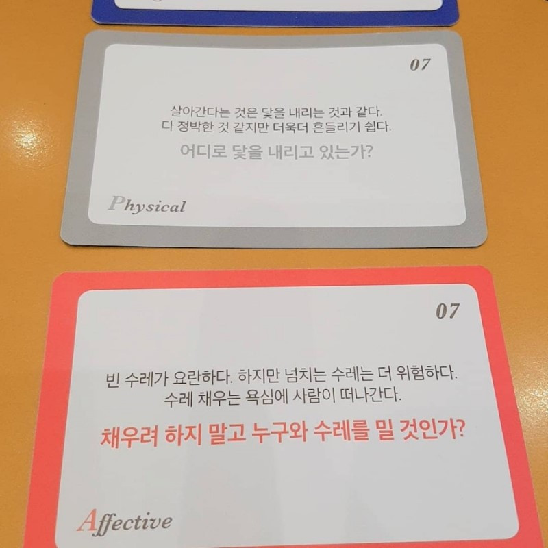 질문을 스토리로 하는 카드는 없었습니다. 페이스북에 원포인트코칭 글을 쓰고, 그 글이 유명해졌습니다. 이제 질문스토리카드 업그레이드를 하기 위해서 노력하고 있습니다. 카드 재질부터 하나하나 만들고 있습니다. 다른 카드에 비해 질문스토리카드 내용이 좋은데도 불구하고 페이스북에서만 보는 것이 안타까웠던 구독자님께서 카드를 만들자고 하는 요청이 있었습니다.