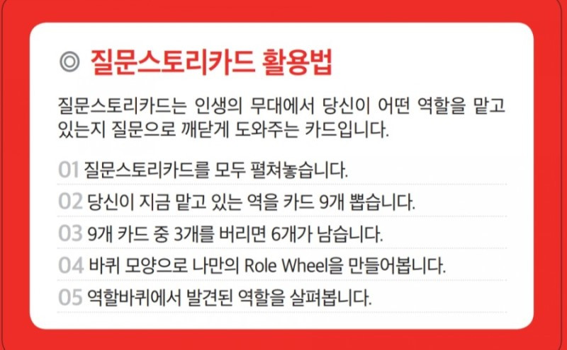 하나의 질문이 세상을 바꾼다! “지금 당신은 어떤 역을 맡고 있는가?” 알고 나면 참 쓸 데가 많은 질문법, 스토리텔링 기법 어떻게 배워야 하는지 난감하다. 질문스토리카드 하나로 두 마리의 토끼를 잡는다고? 질문을 스토리로 활용하는 방법을 카드에 담았다. 컨텐츠에 자신감이 생긴다. 당신의 피드백이 한 방에 달라진다! [질문스토리 카드 활용 강사양성과정]