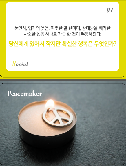 - 퀄리티 높은 사진작가의 이미지를 통해 처음 만나는 사람의 장벽을 깨는 아이스브레이킹 에 좋다. - 자기자신을 이해하는 질문을 담고 있어 질문법을 배우는데 도움이 된다. - 강력한 질문의 힘을 가장 쉽고 빠르게 경험할 수 있는 스토리텔링 도구이다. - 즉시 활용할 수 있는 카드형태의 컨텐츠이기 때문에 리더십, 팀워크, 조직활성화, 의사소통, 대인관계, 서비스교육, 강점교육, 비전워크숍, 경력설계, 취업강의, 코칭 등 쓰임새가 무한대다.
