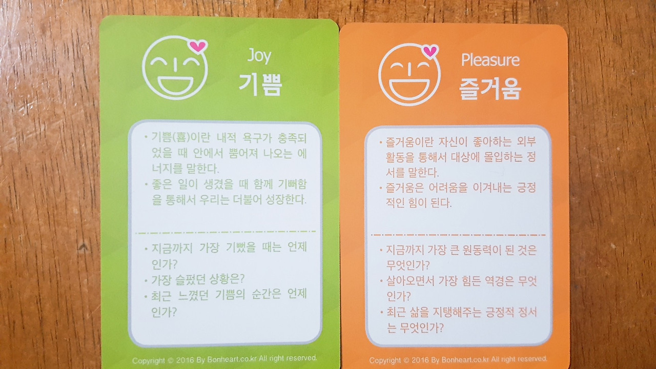 당신은 기쁨과 즐거움의 차이가 무엇이라고 생각하는가? 본하트 정서카드를 만들면서 가장 헛갈리는 것이 기쁨과 즐거움의 차이였다.