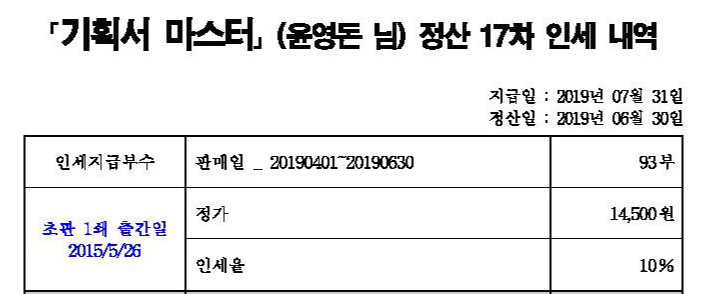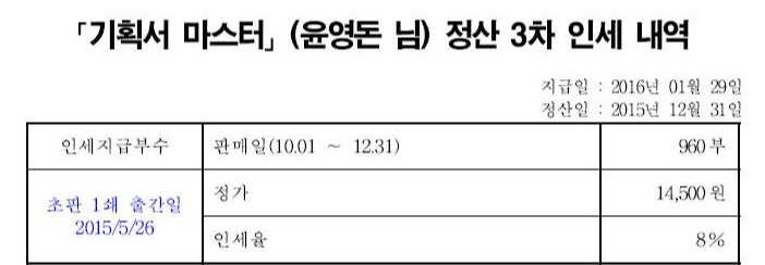 기획서 마스터는 처음에는 643부, 3달 만에 960부로 껑충 뛰었다. 5년이 지난 책이 최근 한 달 동안에 93부가 나갔고 있으니 6쇄까지 꾸준히 팔리는 책인 셈이다. 1쇄는 보통 3000부를 찍는데 요즘은 1500부나 그 이하도 찍는다.