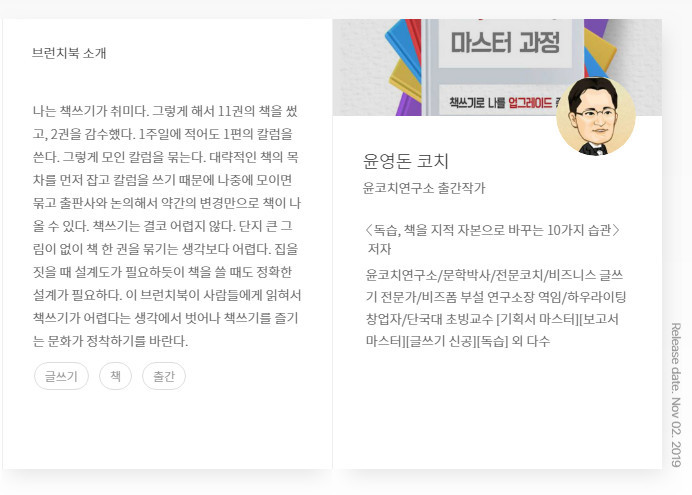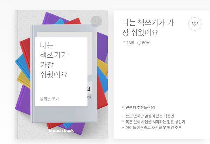 [브런치북] 나는 책쓰기가 가장 쉬웠어요 나는 책쓰기가 취미다. 그렇게 해서 11권의 책을 썼고, 2권을 감수했다. 1주일에 적어도 1편의 칼럼을 쓴다. 그렇게 모인 칼럼을 묶는다. 대략적인 책의 목차를 먼저 잡고 칼럼을 쓰기 때문에 나중에 모이면 묶고 출판사와 논의해서 약간의 변경만으로 책이 나올 수 있다. 책쓰기는 결코 어렵지 않다. 단지 큰 그림이 없이 책 한 권을 묶기는 생각보다 어렵다. 집을 짓을 때 설계도가 필요하듯이 책을 쓸 때도 정확한 설계가 필요하다. 이 브런치북이 사람들에게 읽
