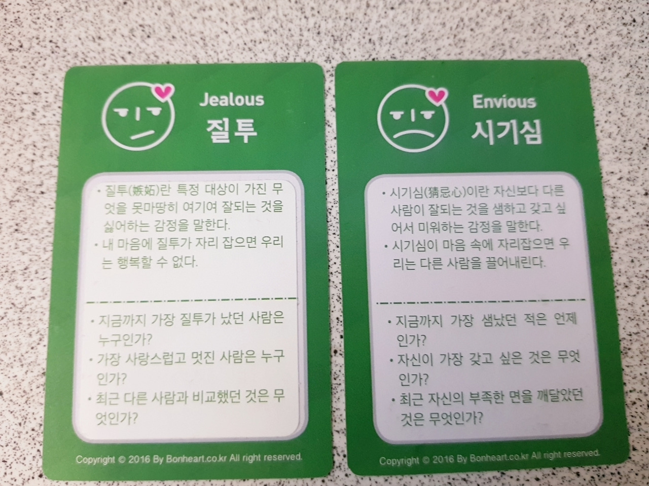 필자가 본하트 정서카드를 만들면서 가장 심려를 기울이는 것이 질투와 시기심이다. 이 두 감정은 일상에서 비슷하게 사용되지만, 엄밀하게 말하면 이 둘은 의미가 무척 다르다. 질투와 시기심의 차이는 무엇일까?