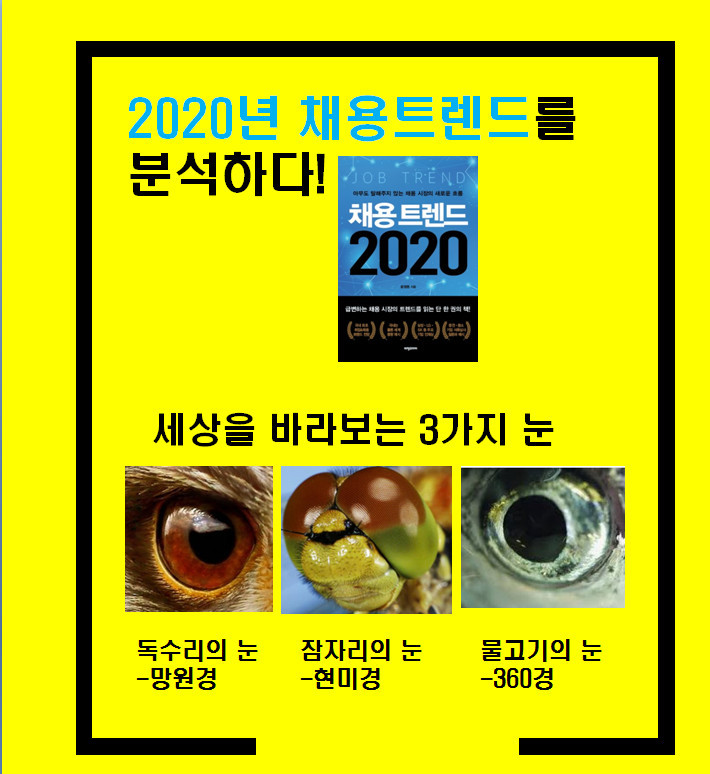 미래에 대한 담론이 넘치는 지금 ! 많은 정보들이 오히려 혼란과 불안을 만들어내는 요즘 시대 ! 생생한 취업현장의 지혜와 통찰이 가득히 담긴 '채용트랜드 2020'가 취업을 꿈꾸며 미래를 계획하는 분들에게 현실적인 가이드 해줄 수 있기를 크게 기대합니다. - 이정민, ㈜HR교육컨설팅 대표 /감성과학연구소장