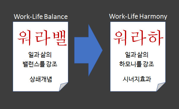 이제 워라밸보다 워라하 시대로 넘어가고 있다. ‘일과 삶의 균형’을 뜻하는 ‘워크 라이프 밸런스(Work-Life Balance)’는 1970년대 영국 워킹맘협회에서 개인의 업무와 사생활 간의 균형을 묘사하는 단어로 처음 등장했으니 벌써 50년이 된 용어이다. ‘공부와 삶의 균형’을 추구하는 것을 의미하는 ‘스라밸(Study-Life Balance)’이라는 용어도 등장했다. 유사하게 ‘머라밸(Money-Life Balance)’이라는 신조어가 탄생할 정도로 소득이 줄어서 ‘돈은 없고 저녁만 있는 삶’에 대한 걱정이 커지기도 했다. 그런데, '밸런스(Balance)'라는 개념은 자신(Self)의 입장만 반영된 것이다. '우리(We)'라는 조직적 개념이 빠진 것이다.