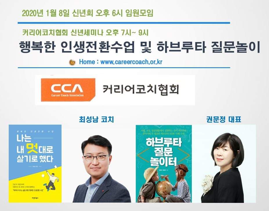 [커리어코치협회 신년세미나]행복한 인생전환수업 및 하브루타 질문놀이 2020년 새로운 계획을 세우셨는지요? 2020년 1월 8일 오후 7시에 신년세미나를 진행합니다. 최성남 코치님이 신간 [나는 내 멋대로 살기로 했다]를 들고 오셨습니다. 권문정 대표님이 [하브루타 질문놀이터]에서 질문이 놀이가 되는 경험을 하실 수 있을 것입니다. 커리어코치협회 임원님들은 2020년 1월 8일(수) 오후 6시에 홍대밀방에서 만나서 이야기의 꽃을 피우겠습니다. 이후 7시에 이동에서 신년세미나를 참가하도록 하겠습니다. 행복과 함께 하는 20